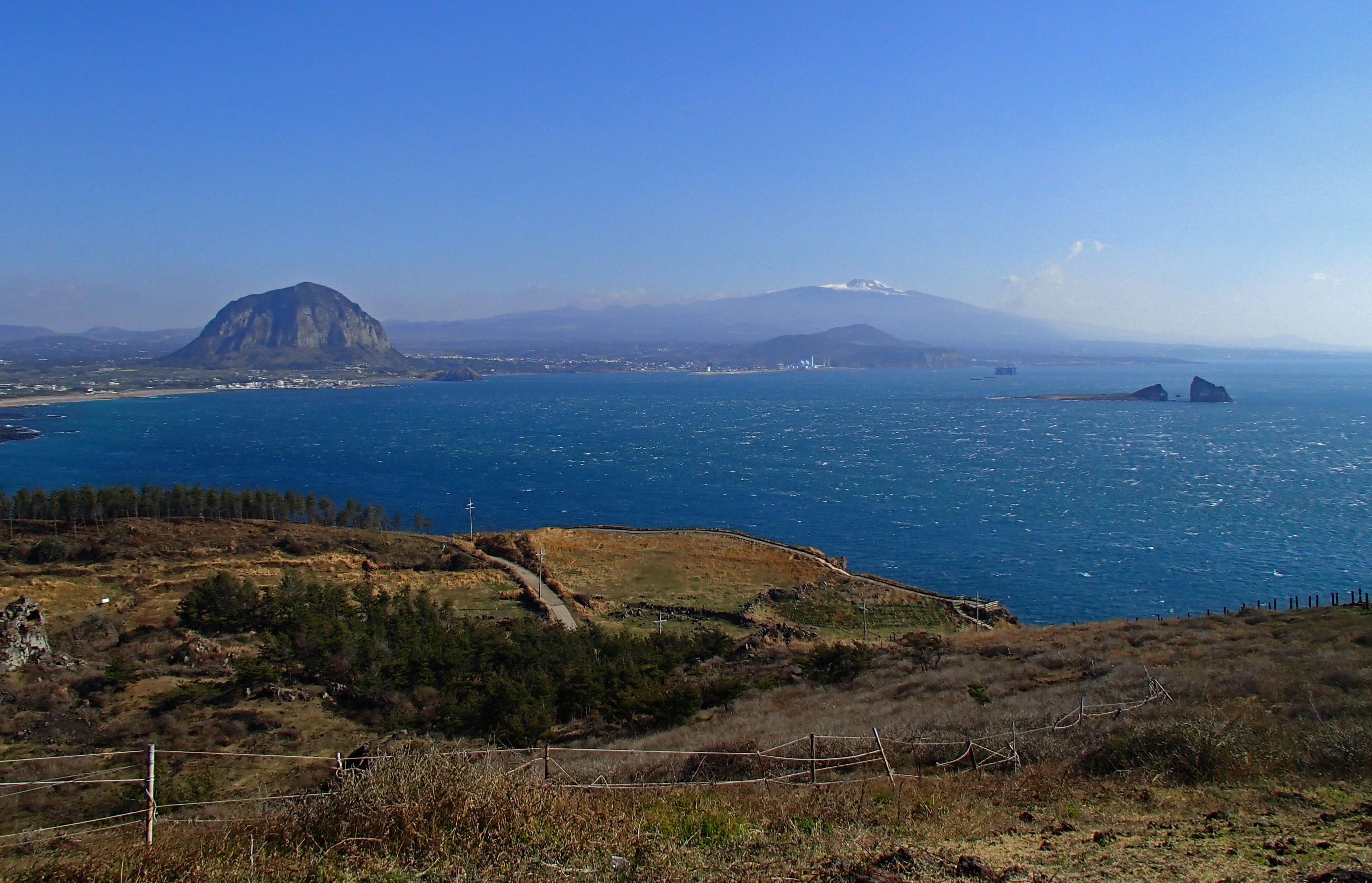 제2차 세계 대전 당시 일본군은 송악산의 해안 절벽에 군사용 굴을 뚫어 기지화하였다.[3] 일본군은 송악산 주변에 군용 비행장(현 알뜨르 비행장)을 만들어 가미카제 전투기의 출격과 같은 용도로 전쟁에 이용하였다.[4]4. 2. 송악산 정상에서 바라본 풍경