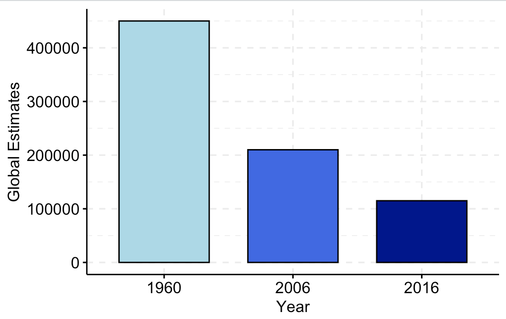 난획으로 인해 개체 수가 급감했다.[40] 1970년대 초기의 개체 수는 50만 마리로 추정된다.[40]