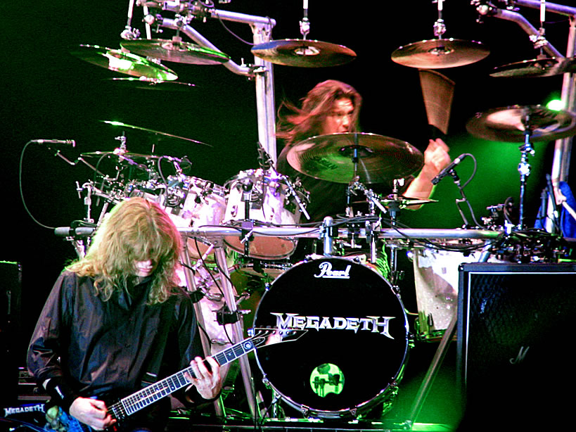 드로버(배경)와 데이브 머스테인이 2005년 메가데스에서 공연하는 모습