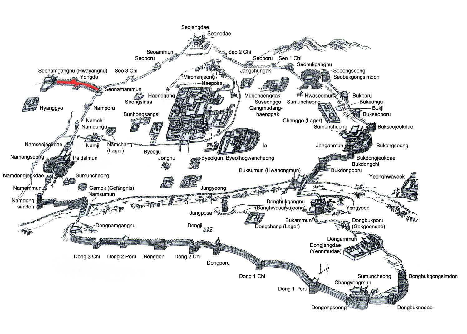 성벽 구조물은 남문(대중교통 이용 접근 지점)에서 시작하여 시계 반대 방향으로 나열할 수 있다.[8]