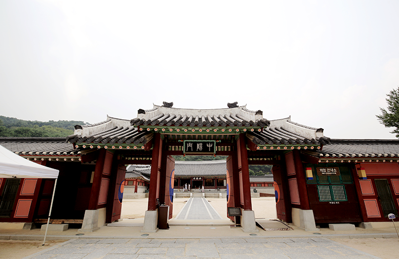 중양문(中陽門)은 궁궐 건축의 삼문 설치 형식에 따라 행궁의 정전인 봉수당을 바로 앞에서 가로막아 굳게 지키는 역할을 하는 내삼문(內三門)이다. 1790년(정조 14)에 완성되었고, 가운데의 정문과 좌우의 협문이 있고 좌우로 행각을 두어 출입을 통제하였다. 1795년 봉수당 진찬례 때 봉수당 앞으로는 정조와 혜경궁을 비롯한 왕실의 종친과 대신들이 자리하였고, 중앙문 밖으로 대문을 활짝 열어 승지와 사관, 각신이 반열을 이루었던 바 있다.