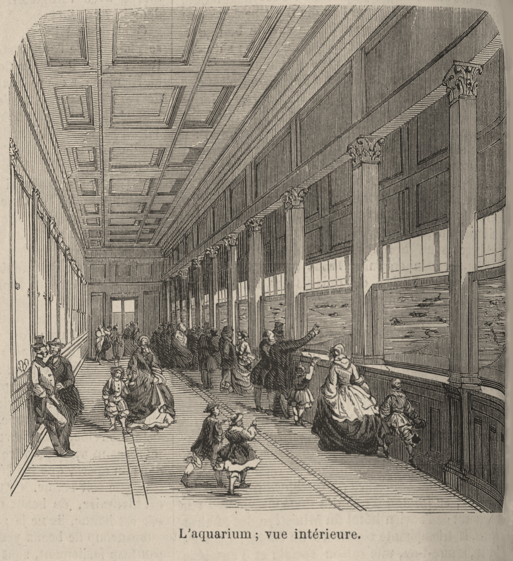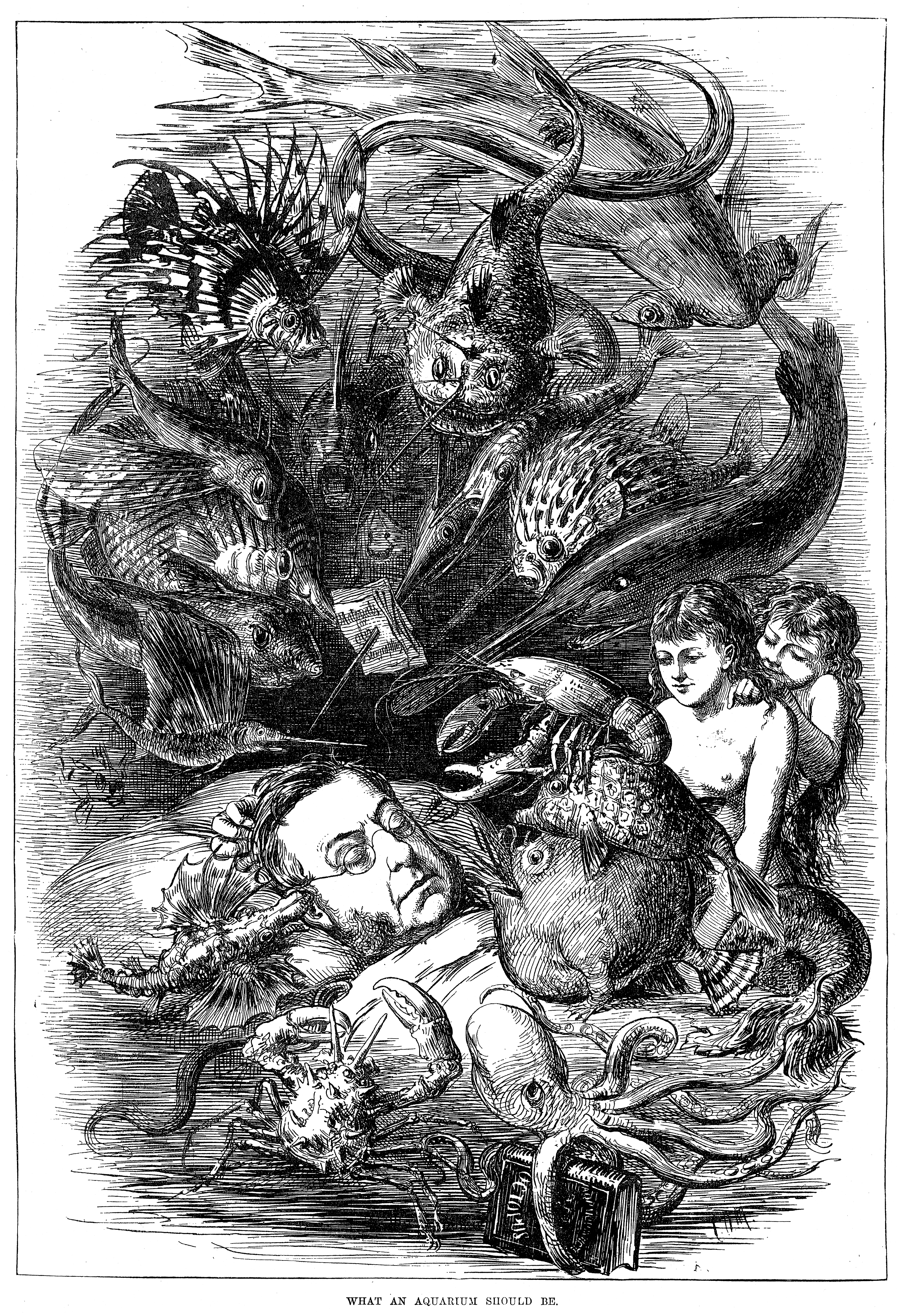 수족관 사육은 점차 인기 있는 취미로 자리 잡았다. 특히 1851년 런던 만국 박람회에 주철 프레임으로 만든 화려한 수족관이 전시되면서 대중의 관심이 높아졌다. 1853년에는 필립 헨리 고스가 런던 동물원에 최초의 공공 수족관(일명 'Fish House')을 만들고 채워 넣으면서 영국에서 본격적인 수족관 열풍을 일으켰다.[18] 고스는 1854년 자신의 저서 ''The Aquariums: An Unveiling of the Wonders of the Deep Water''에서 'aquatic vivarium' 대신 'aquarium'이라는 용어를 처음 사용했으며, 이 책은 주로 해수 수족관을 다루었다.[2][19] 1850년대 영국에서는 수족관이 큰 유행이 되었다.[20]