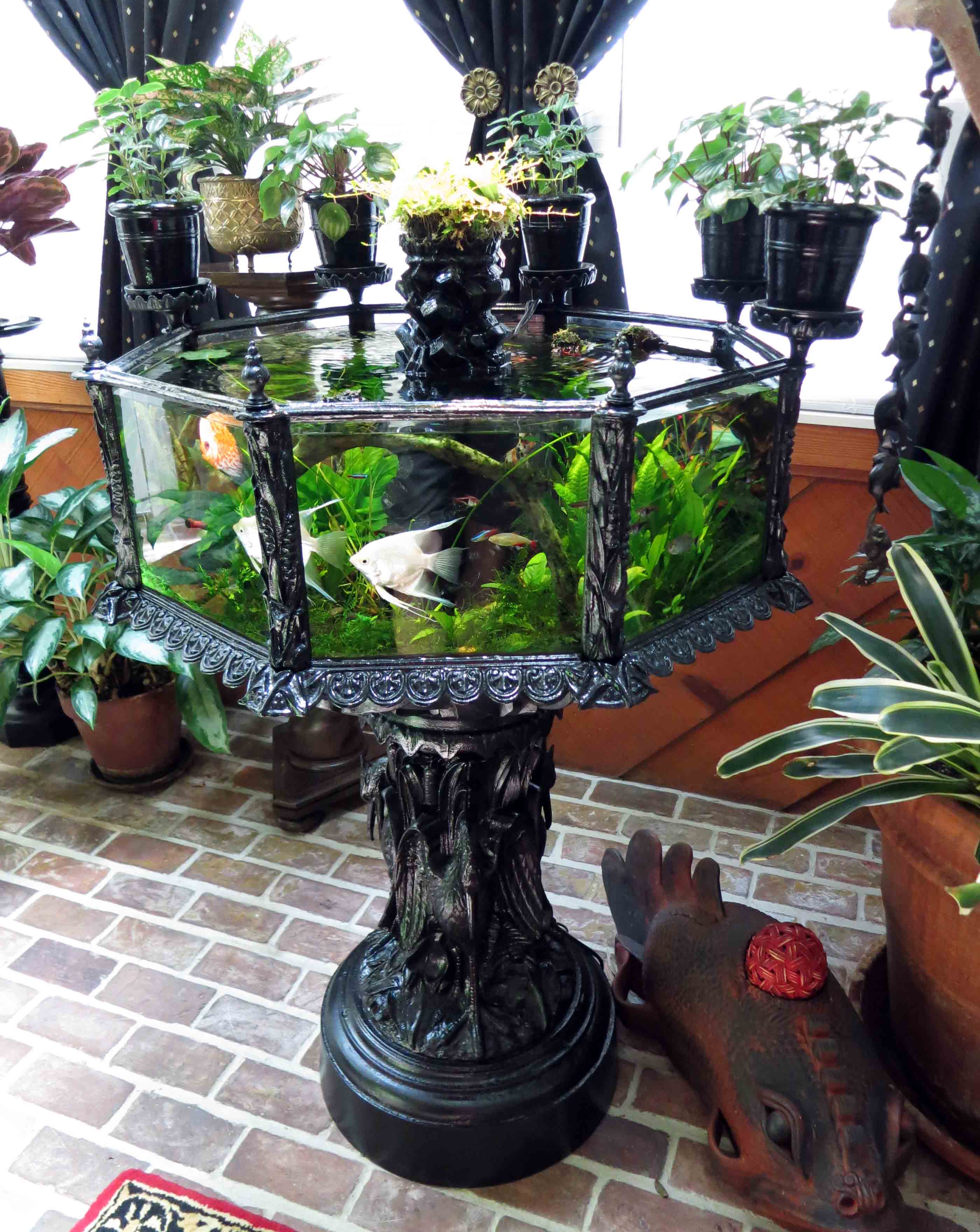 빅토리아 시대 영국의 가정용 수족관은 주로 유리 전면에 나무로 된 측면(방수를 위해 송진 코팅)을 가지고 있었고, 바닥은 슬레이트로 만들어 아래에서 가열하는 형태였다.[28] 이후 금속 프레임의 유리 탱크가 등장하는 등 더욱 발전된 시스템이 도입되었다.[28] 19세기 후반에는 수족관을 벽에 걸거나, 창문의 일부로 만들거나, 새장과 결합하는 등 다양한 디자인이 시도되었다.[29]