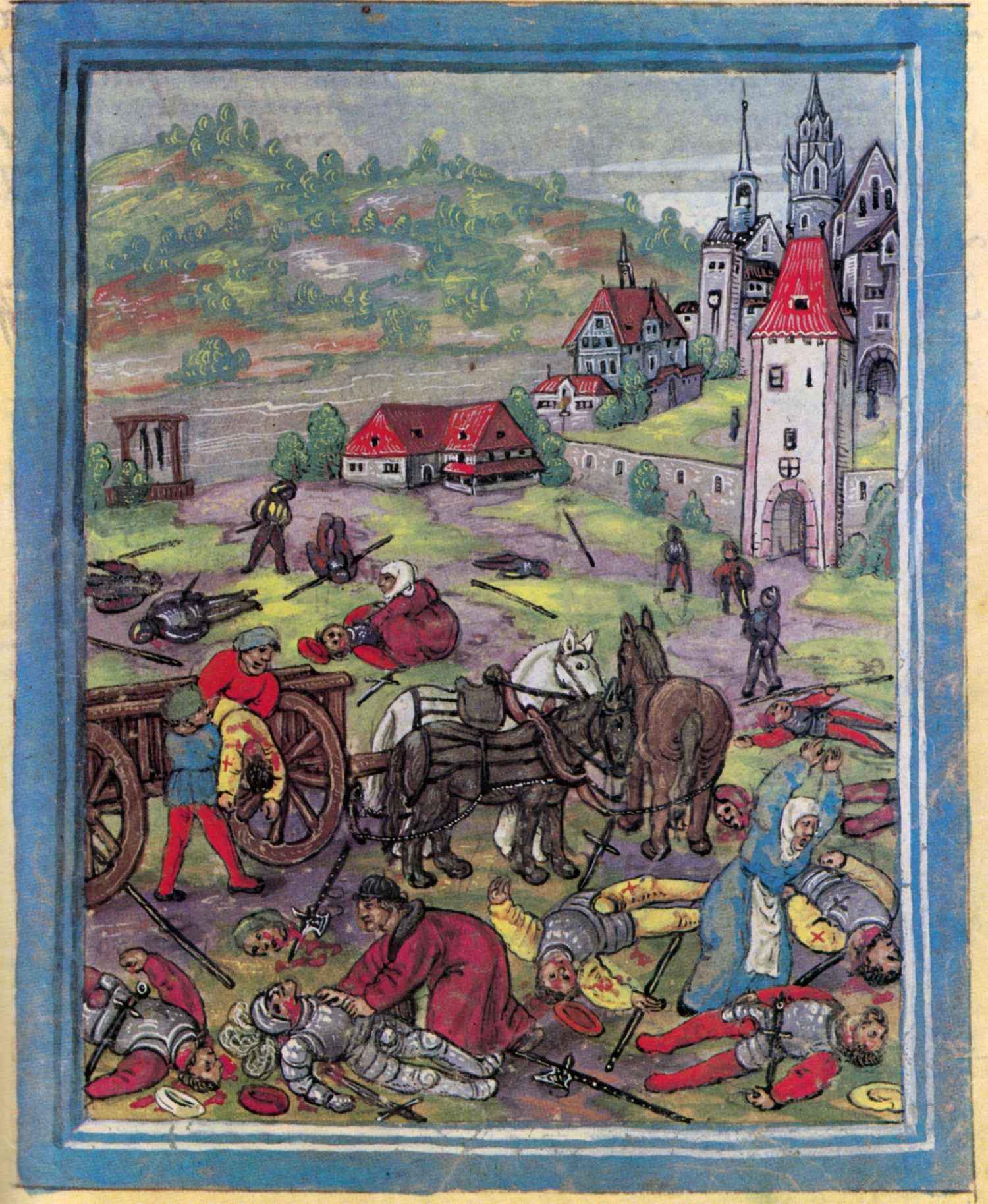 슈바더로 전투 후 콘스탄츠 성문 밖에서 슈바벤 병사들의 시신을 수습하는 여성과 사제들. (루체른 실링에서)