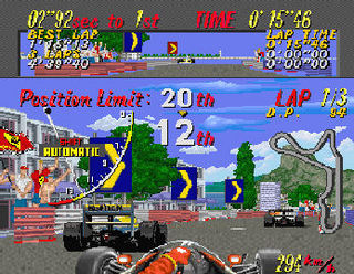 F1 익조스트 노트 | 1991년 11월 | AM2 연구소 | 아케이드 | 갤럭시 포스에 사용된 Y-BOARD의 개량 버전인 시스템 32 보드를 사용했다. 리어 뷰 등 슈퍼 모나코 GP의 화면 구성을 계승했으며, 게임기에 액티브 스피커를 탑재하여 엔진 소리와 배경 음악의 박진감을 높였다. 싱글 플레이용 게임기는 없고, 2인용 TWIN 게임기 전용 타이틀이다. 플레이어는 AT(자동 변속) 또는 7단 MT(수동 변속)를 선택할 수 있으며, 인테르라구스 서킷과 유사하게 디자인된 오리지널 코스에서 경주한다. |