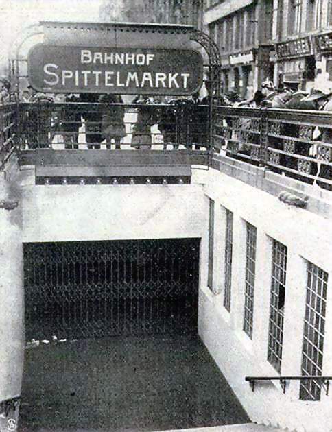 1908년 10월 1일, 베를린의 두 번째 U-Bahn 노선 개통과 함께 슈피텔마르크트역이 영업을 시작했다. 이 역은 초기 '간선' 노선을 통해 포츠다머 플라츠와 연결되었다. 역 이름은 1400년경에 세워진 성 게르트루트 병원의 옛 부지였던 '슈피텔마르크트' 광장에서 유래했다. 알프레드 그레난더가 설계한 이 역은 슈프레 강둑 바로 아래에 지어졌으며, 수면 위에 채광창이 있는 독특한 구조였다.[4]