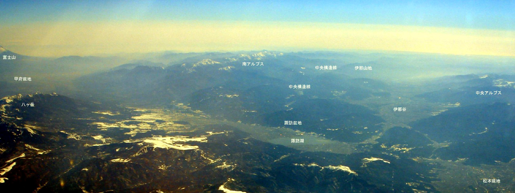 이미지 캡션 | 오부치자와 부근 상공에서 바라본 스와호. 먼 곳은 마쓰모토 분지 |