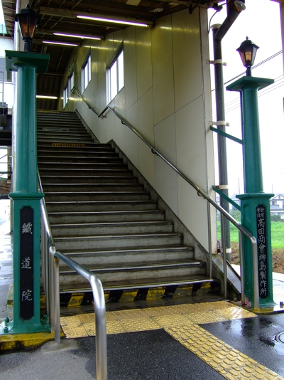 구 역사 시대부터 양쪽 승강장의 육교 옆에는 철도원 시대의 육교 기둥이 가로등처럼 개조되어 남아 있으며, 철기둥에는 메이지일본어 45년(1912년) 7월 제조 및 합자회사 고다 상회 야나기시마 제작소의 명문이 새겨져 있다. 현재 이 철기둥은 교상역사화 당시 갈색으로 도색되어 시간표 게시판의 프레임으로 개조되어 설치되어 있다. 같은 철기둥이 게이힌토호쿠선 오모리역 동쪽 출구 광장에 보존되어 있다.[1]