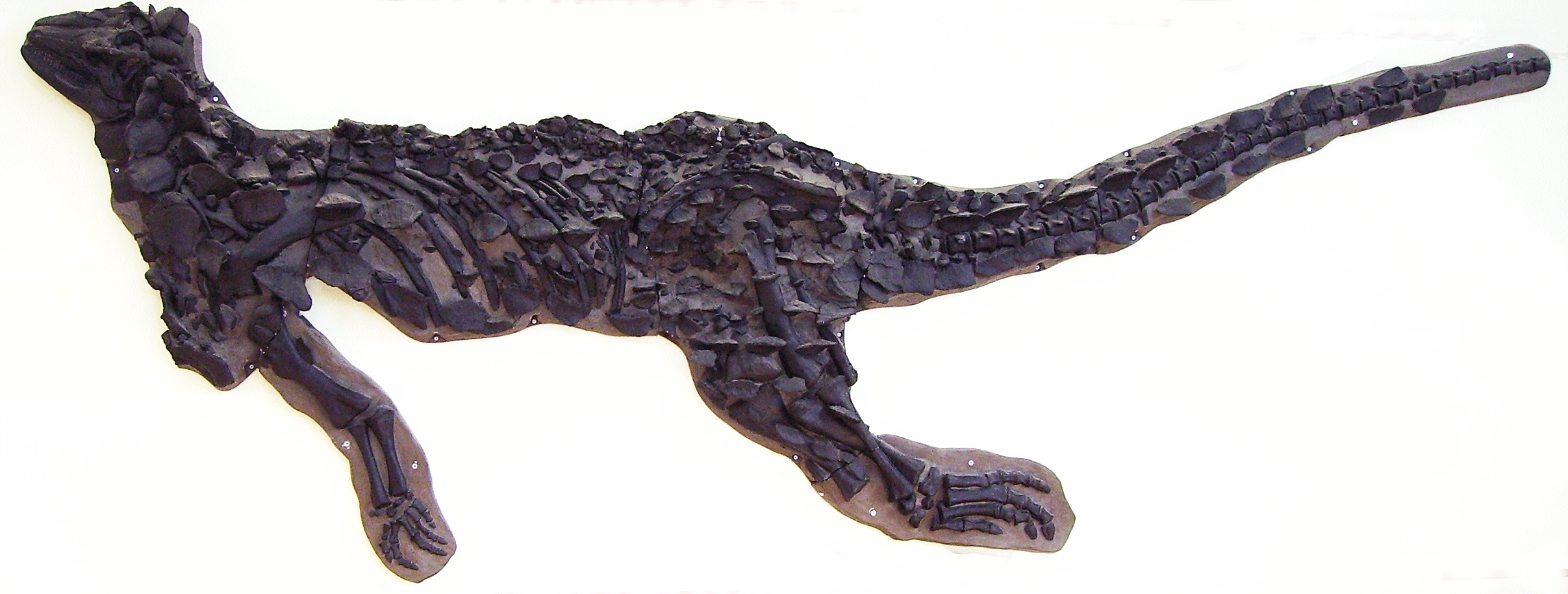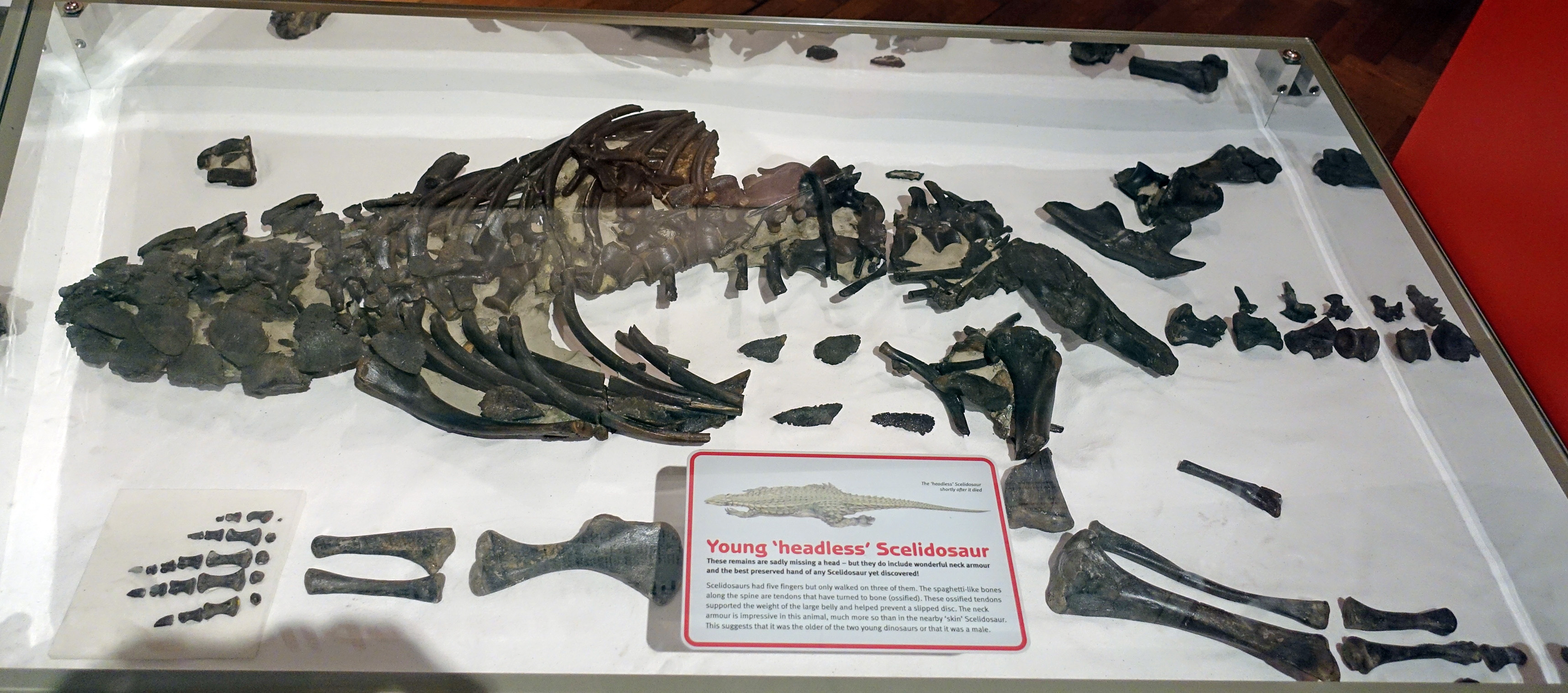 2000년 데이비드 솔(David Sole)이 발견한 거의 완전한 골격 화석 모형. 화석화된 뼈 골편을 보여준다. Charmouth Heritage Coast Centre