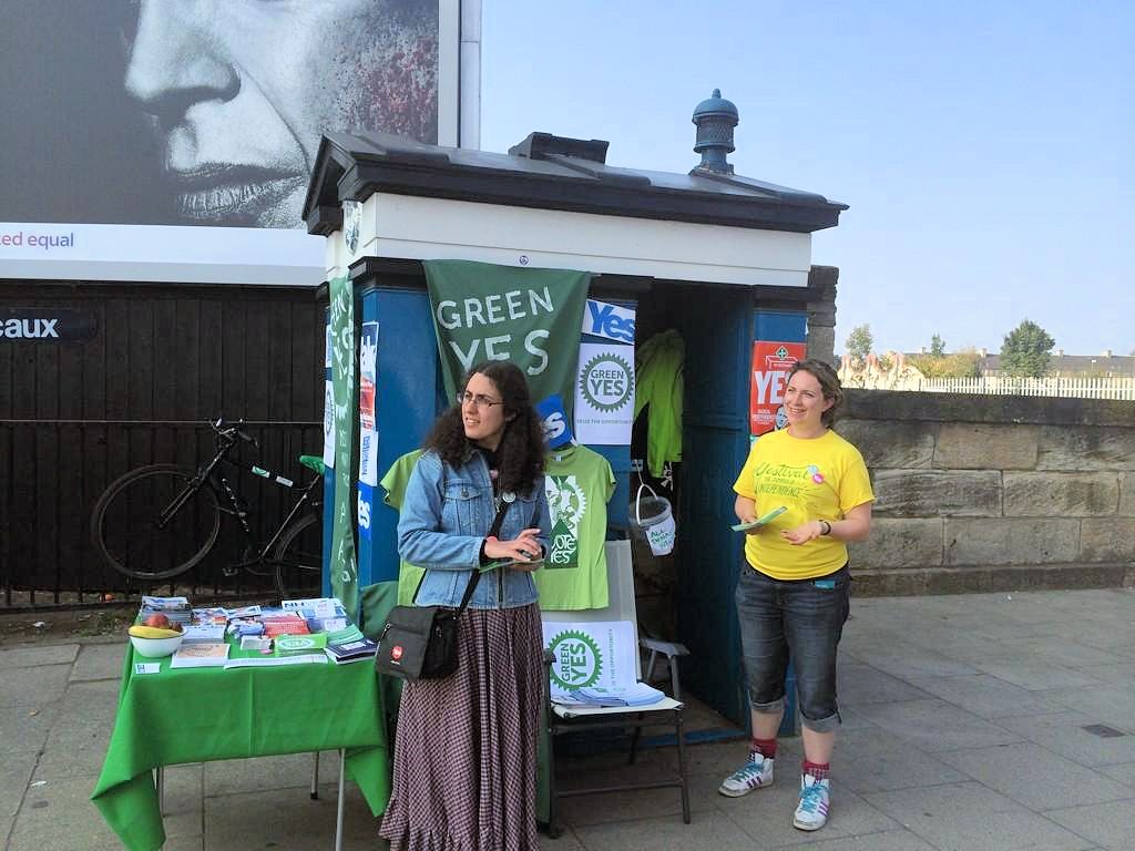 '녹색 예스' 캠페인을 통해 스코틀랜드 녹색당은 독립이 급진적인 변화를 가져올 수 있는 유일한 방법이며, 이 당의 독립 비전은 진보적이며 명시적으로 민족주의적이지 않다고 주장했다.[41][42] 패트릭 하비는 권한 이양이 스코틀랜드인들에게 중요한 긴축 문제를 해결하기에는 충분하지 않다고 강조했다.[43]