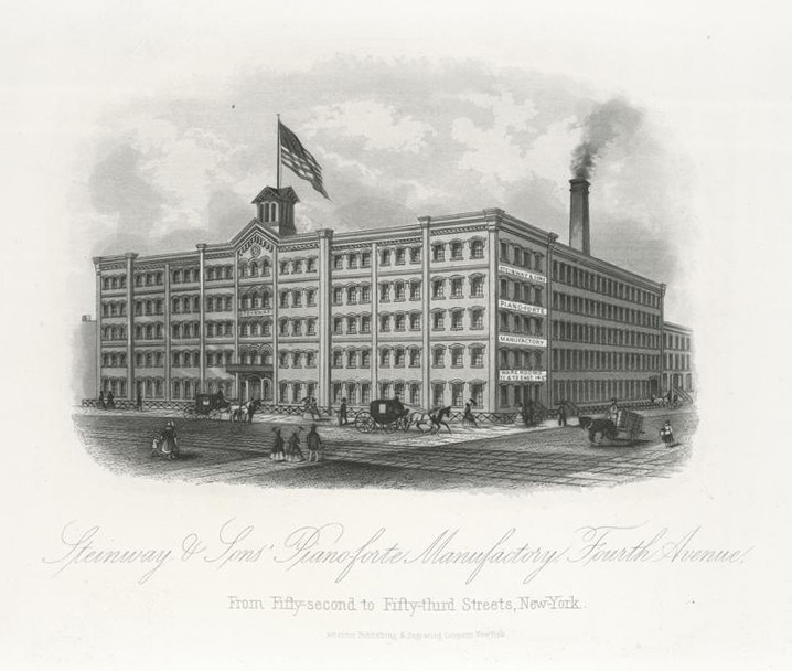 하인리히 엥겔하르트 슈타인베크는 1850년 가족과 함께 독일에서 미국으로 이주하여 1853년 뉴욕 시에 스타인웨이 앤드 선즈를 설립했다.[34] 최초의 작업장은 맨해튼 바릭 스트리트 85번지에 있는 작은 로프트였다.[36]스타인웨이 가족은 혁신적인 기술을 도입한 피아노를 만들어 미국과 유럽에서 명성을 얻었다.[288] 1860년대까지 스타인웨이는 파크 애비뉴 52번가와 53번가 사이(현재 시그램 빌딩 부지)에 공장을 건설하여 이전했는데, 그 면적이 블록 전체를 덮을 정도였다. 350명의 직원을 고용하여 연간 생산량이 500대에서 거의 1,800대로 증가했다.[41]