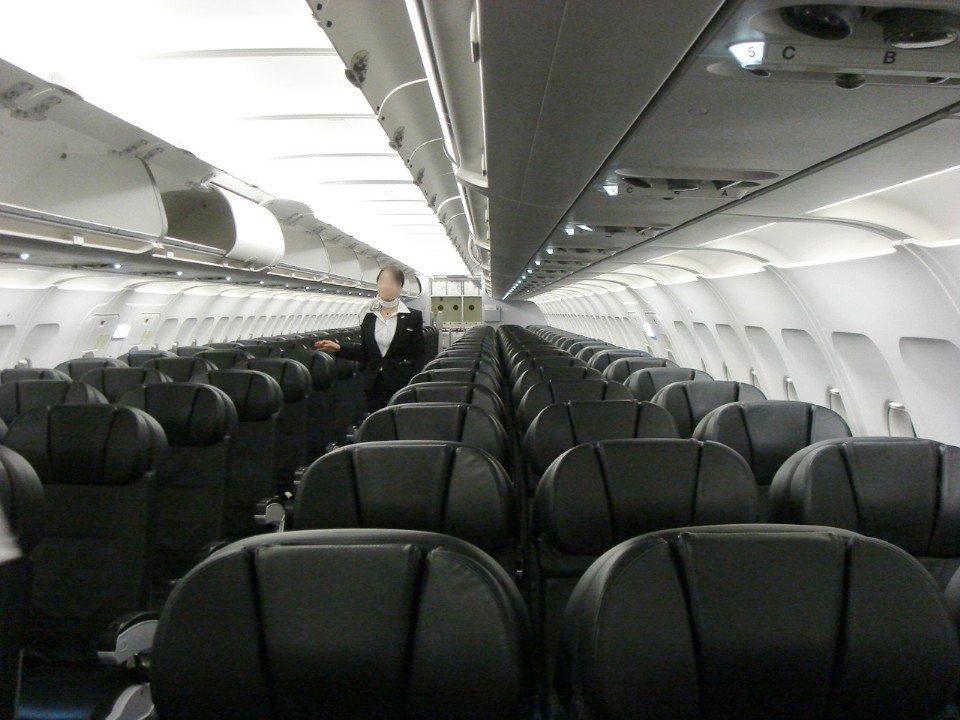 에어버스 A320 (A320ceo)에서는 1 클래스 메이커 표준 164석[98]을 150석[99] 사양으로 줄여 운항하기 때문에, 일반석으로서는 비교적 시트에 여유가 있다. 전후 간격은 91 - 94cm이다. 좌석은 전 좌석 검은색의 가죽 시트이며, 가동식 헤드레스트 및 풋레스트, 개인형 액정 모니터와 발밑에 전자 기기용 전원 콘센트 등의 설비를 갖추고 있다.
