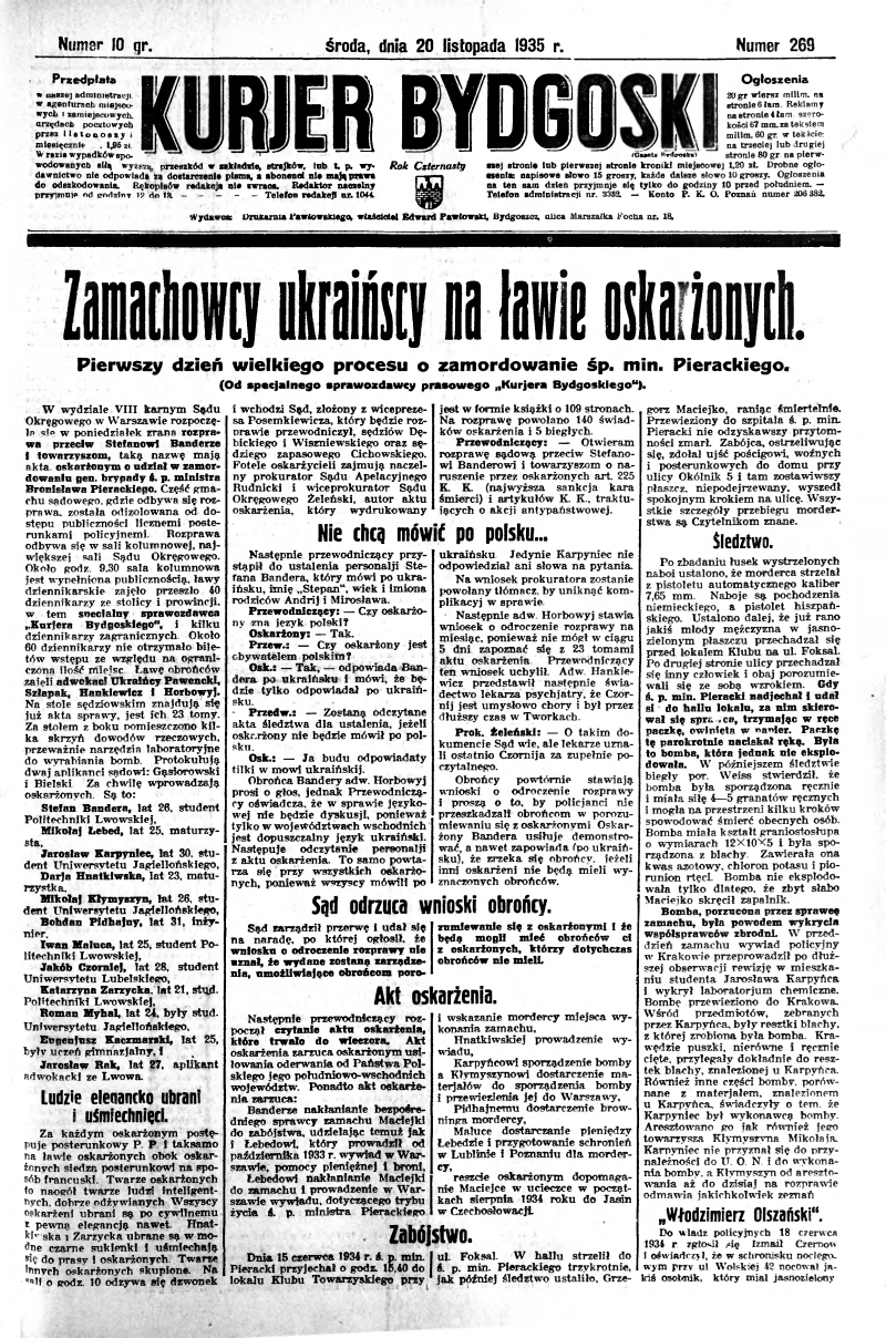 반데라의 명령에 따라 OUN은 우체국 공격, 폴란드 전시회 폭탄 투척, 경찰 살해 등의 테러 행위를 시작했고, 폴란드 담배 및 주류 독점에 대한 대규모 캠페인과 우크라이나 청년의 민족 말살 반대 운동을 벌였다. 1934년 반데라는 리비우(Lwów)에서 체포되어 두 차례 재판을 받았다. 첫 번째는 내무부 장관 브로니스와프 피에라츠키(Bronisław Pieracki) 암살 음모에 연루된 혐의였고, 두 번째는 OUN 간부들의 일반적인 재판이었다. 그는 테러 혐의로 유죄 판결을 받고 사형을 선고받았지만, 사형은 무기징역으로 감형되었다.[147]
