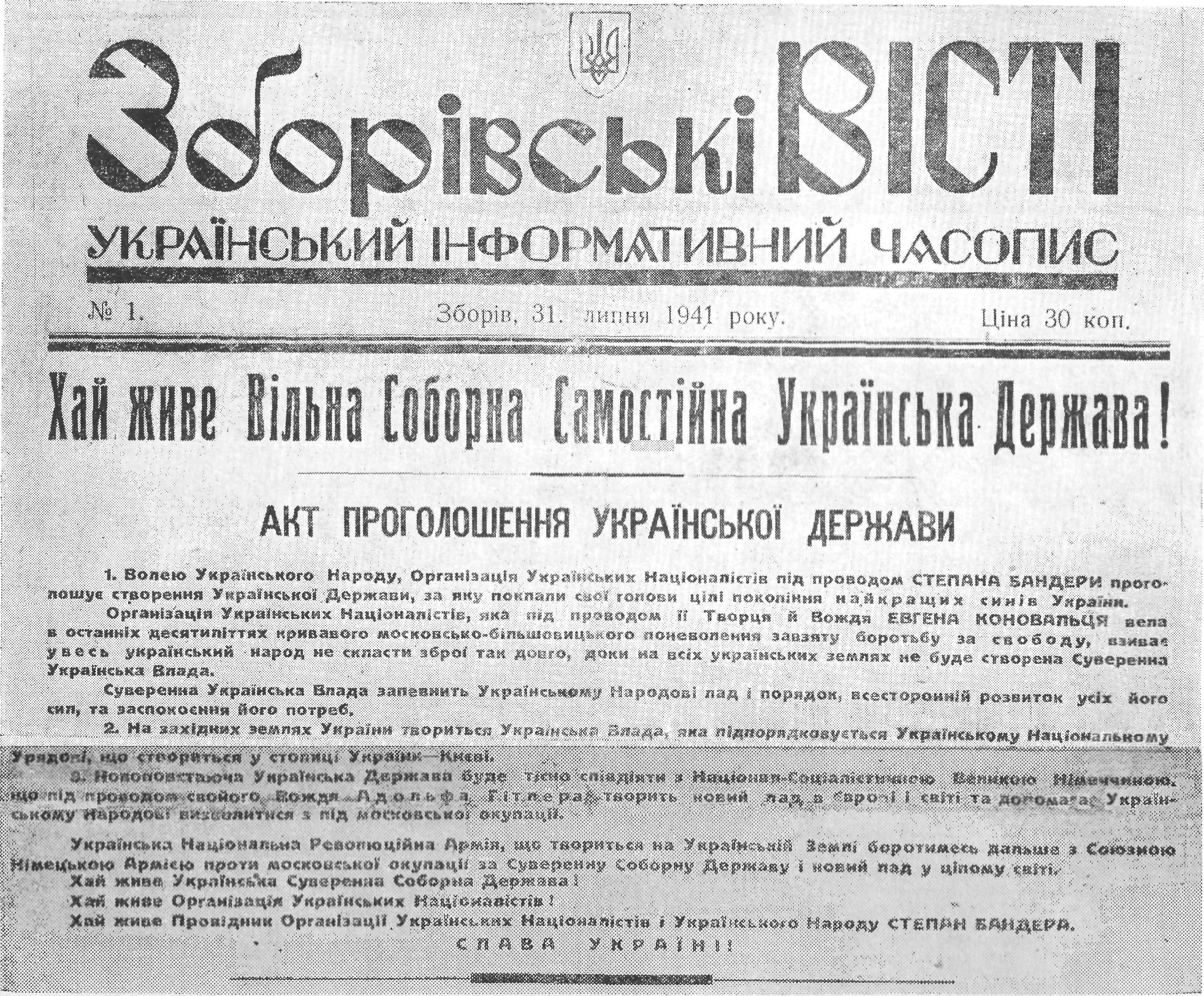 1941년 6월 30일, 나치 독일군이 우크라이나에 도착하자 OUN-B는 일방적으로 독립 우크라이나 국가(우크라이나 국가 재건 선언)를 선포했다.[38] 선언은 아돌프 히틀러의 지도 아래 새로운 우크라이나 국가와 나치 독일의 협력을 약속했다. 이 선언은 폭력적인 포그롬과 함께였다.[39]