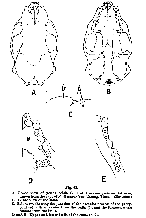 티베트 초원족제비 M. e. larvatus | Hodgson, 1849 | 알려지지 않은 대형 아종.[9] | 티베트, 카슈미르 | tibetanus (Horsfield, 1851) |