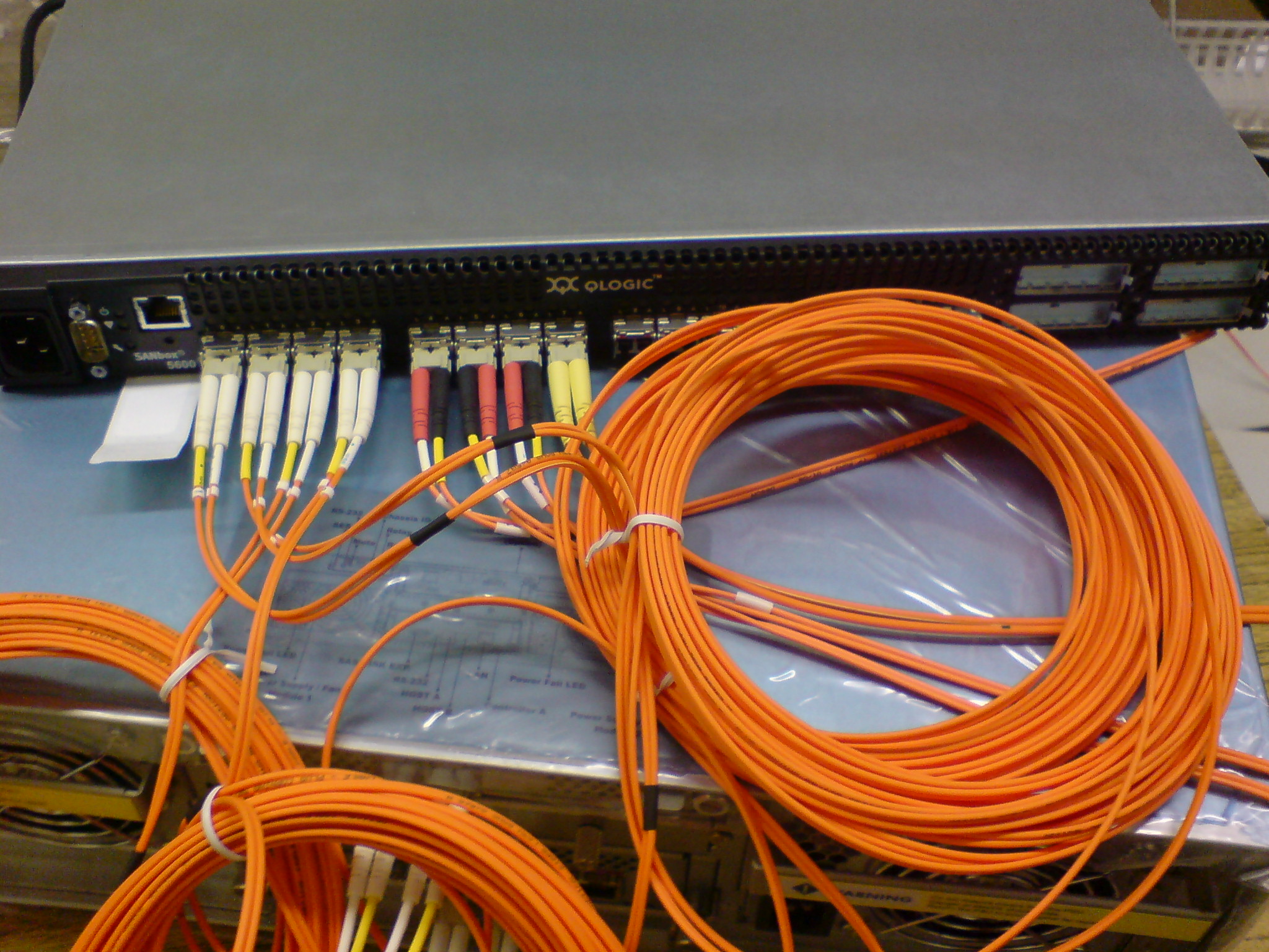 패브릭 계층은 SAN 스위치, 라우터, 프로토콜 브리지, 게이트웨이 장치 및 케이블을 포함하는 SAN 네트워킹 장치로 구성된다. SAN 네트워크 장치는 서버의 HBA 포트와 같은 ''이니시에이터''와 스토리지 장치의 포트와 같은 ''타겟'' 사이에서, 또는 SAN 내에서 데이터를 이동시키는 역할을 한다.[3]파이버 채널을 지원하는 장치로는 SAN이 처음 구축되었을 때 허브가 유일했지만, 파이버 채널 스위치가 개발되면서 현재 SAN에서는 허브가 거의 사용되지 않는다. 스위치는 모든 연결된 장치가 동시에 통신할 수 있도록 허브보다 유리하며, 모든 포트를 서로 연결하기 위한 전용 링크를 제공한다.[4] SAN이 처음 구축되었을 때는 파이버 채널이 구리 케이블을 통해 구현되어야 했지만, 요즘에는 멀티모드 광섬유 케이블이 SAN에서 사용된다.[4]
