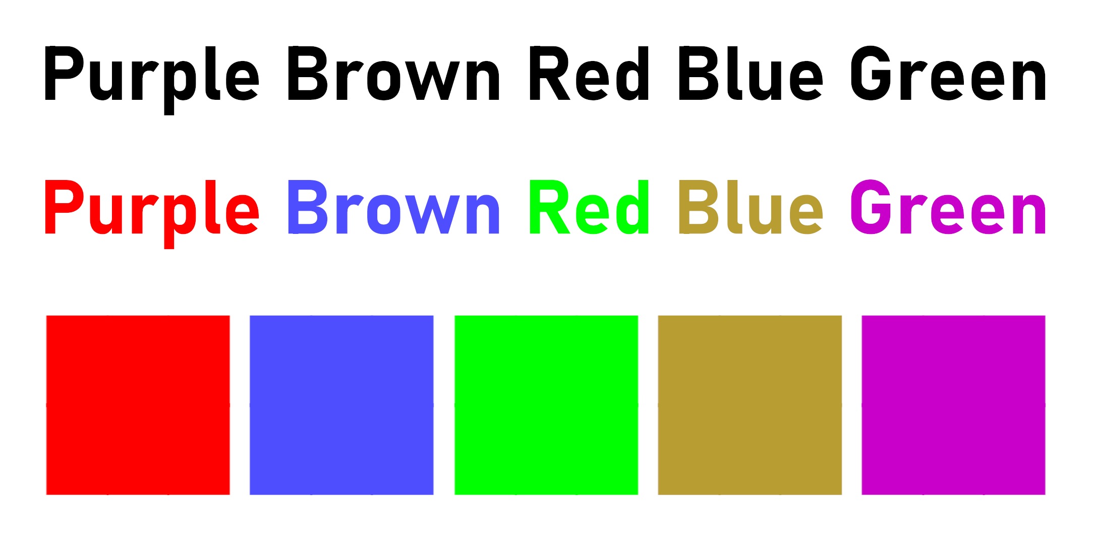 첫 번째 실험에서는 단어와 갈등 단어가 사용되었다. 참가자는 잉크의 색상과 관계없이 쓰여진 색상 단어를 읽어야 했다. 예를 들어, 글꼴 색상과 관계없이 "보라색"을 읽어야 했다.[2]