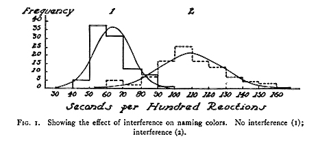 스트루프는 참가자가 실험 2에서 사각형의 색상을 명명하는 데 걸린 시간보다 두 번째 과제에서 색상 읽기를 완료하는 데 훨씬 더 오래 걸렸다는 것을 언급했다. 이러한 지연은 첫 번째 실험에서는 나타나지 않았다. 이러한 간섭은 마음이 단어의 의미론적 의미를 자동으로 결정하고, 의도적으로 단어의 색상을 식별해야 하는 자동화된 읽기에 의해 설명되었다.[2]
