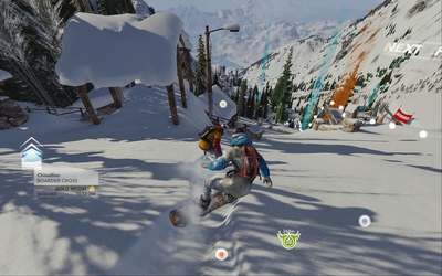 플레이어가 산에서 스노보드를 타는 게임 플레이 스크린샷.