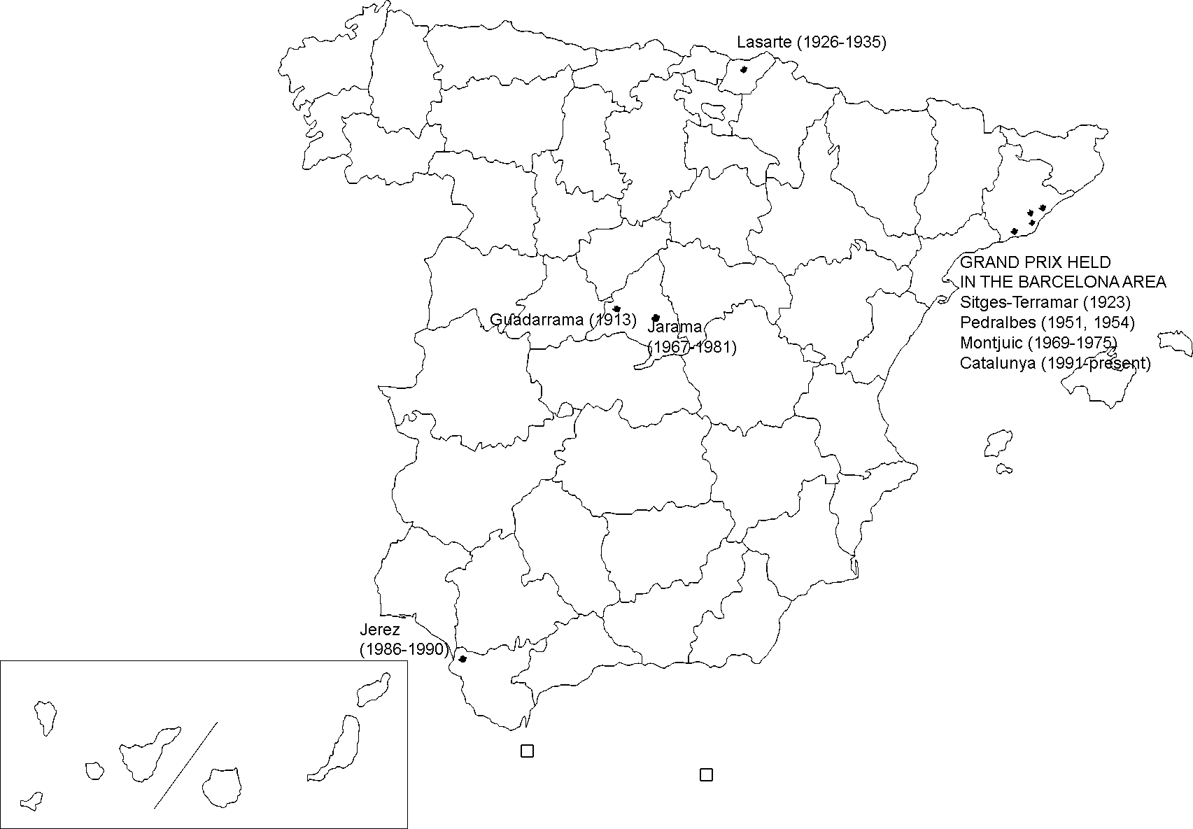 스페인 그랑프리는 1913년 마드리드 인근 과다라마 산맥의 도로 코스에서 투어링카 경주로 처음 시작되었다. 이후 1923년 카탈루냐주 시체스의 시체스-테라마르 서킷, 1926년부터는 바스크 지방의 라살테 서킷 등 여러 장소를 거치며 개최되었으나, 1936년 스페인 내전 발발로 인해 장기간 중단되었다.