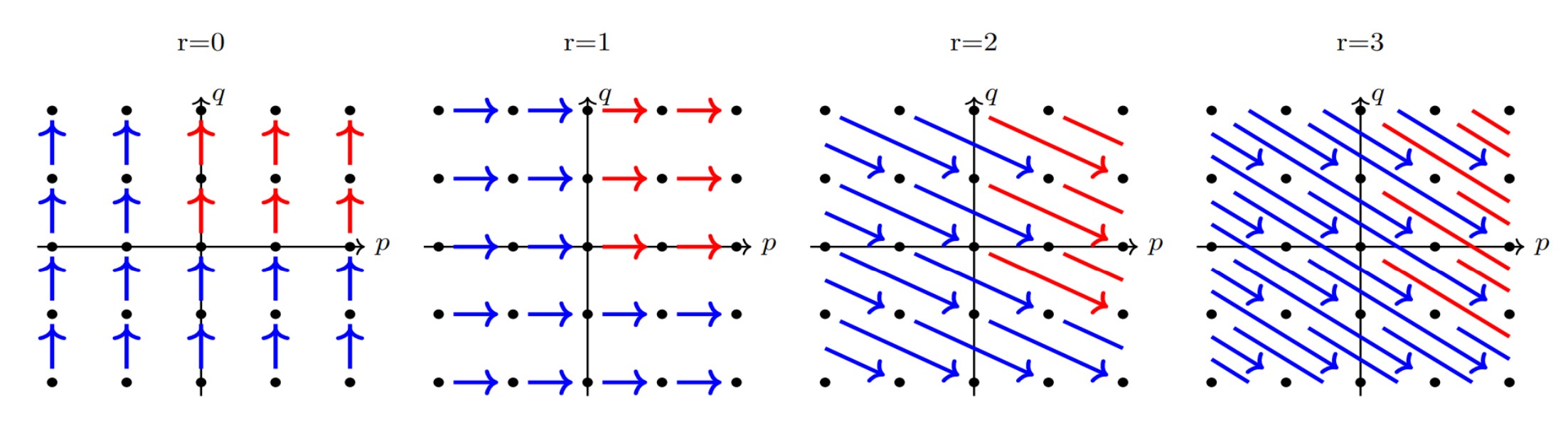 빨간색 화살표는 제1 사분면 수열(예: 스펙트럼 열#제1 사분면 시트)을 나타내며, 제1 사분면 객체만 0이 아니다. 페이지를 넘기면서 모든 미분 정의역/공역이 0이 된다.