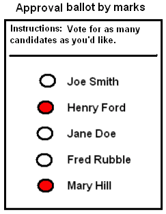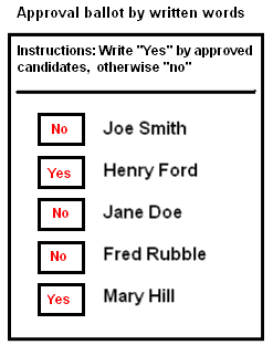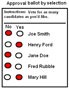 무정보 | style="background:#FFC7C7;color:black;vertical-align:middle;text-align:};" class="table-no"|} |style="background:#9EFF9E;color:black;vertical-align:middle;text-align:};}" class="table-yes"|} |style="background:#FFC7C7;color:black;vertical-align:middle;text-align:};}" class="table-no"|} |style="background:#FFC7C7;color:black;vertical-align:middle;text-align:};}" class="table-no"|} |style="background:#FFC7C7;color:black;vertical-align:middle;text-align:};}" class="table-no"|} |style="background:#9EFF9E;color:black;vertical-align:middle;text-align:};}" class="table-yes"|} |style="background:#9EFF9E;color:black;vertical-align:middle;text-align:};}" class="table-yes"|} |style="background:#FFC7C7;color:black;vertical-align:middle;text-align:};}" class="table-no"|} |- !리더 규칙[69] |style="background:#9EFF9E;color:black;vertical-align:middle;text-align:};}" class="table-yes"|} |style="background:#9EFF9E;color:black;vertical-align:middle;text-align:};}" class="table-yes"|} |style="background:#9EFF9E;color:black;vertical-align:middle;text-align:};}" class="table-yes"|} |style="background:#FFC7C7;color:black;vertical-align:middle;text-align:};}" class="table-no"|} | | | |style="background:#9EFF9E;color:black;vertical-align:middle;text-align:};}" class="table-yes"|} |style="background:#FFC7C7;color:black;vertical-align:middle;text-align:};}" class="table-no"|} |- !떨리는 손[70] |style="background:#9EFF9E;color:black;vertical-align:middle;text-align:};}" class="table-yes"|} |style="background:#9EFF9E;color:black;vertical-align:middle;text-align:};}" class="table-yes"|} |style="background:#9EFF9E;color:black;vertical-align:middle;text-align:};}" class="table-yes"|} |style="background:#FFC7C7;color:black;vertical-align:middle;text-align:};}" class="table-no"|} | | | |style="background:#9EFF9E;color:black;vertical-align:middle;text-align:};}" class="table-yes"|} |style="background:#FFC7C7;color:black;vertical-align:middle;text-align:};}" class="table-no"|} |- ! 이분법적 선호 |style="background:#9EFF9E;color:black;vertical-align:middle;text-align:};}" class="table-yes"|} |style="background:#9EFF9E;color:black;vertical-align:middle;text-align:};}" class="table-yes"|} |style="background:#9EFF9E;color:black;vertical-align:middle;text-align:};}" class="table-yes"|} |style="background:#9EFF9E;color:black;vertical-align:middle;text-align:};}" class="table-yes"|} |style="background:#9EFF9E;color:black;vertical-align:middle;text-align:};}" class="table-yes"|} |style="background:#9EFF9E;color:black;vertical-align:middle;text-align:};}" class="table-yes"|} |style="background:#9EFF9E;color:black;vertical-align:middle;text-align:};}" class="table-yes"|} |style="background:#9EFF9E;color:black;vertical-align:middle;text-align:};}" class="table-yes"|} |} 승인 투표에서는 투표자는 각 후보자마다 독립적으로 투표를 하기 때문에, 불필요한 후보가 입후보해도 다른 후보의 득표수에 영향이 없다. 4. 사례