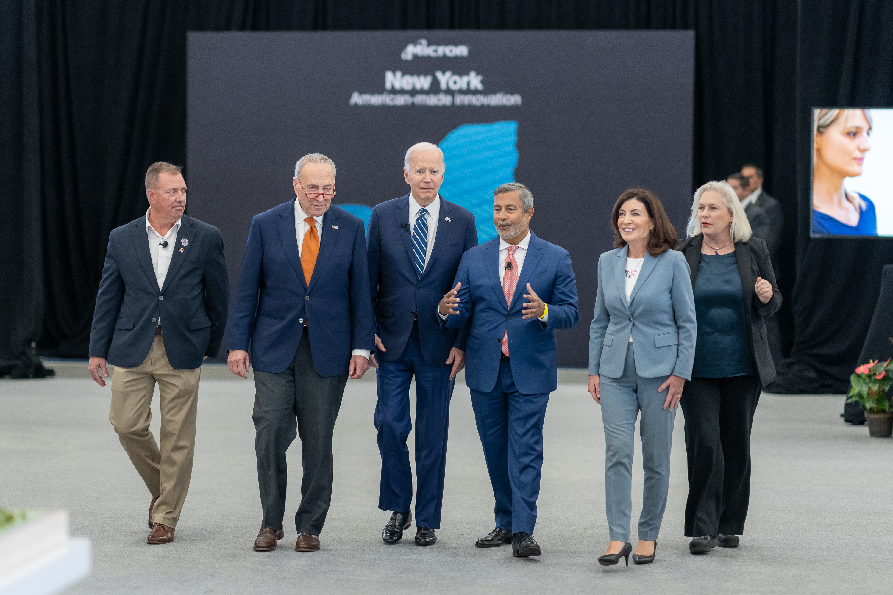 조 바이든 대통령이 시러큐스에서 캐시 호출 주지사, 산제이 메흐로트라 마이크론 CEO, 척 슈머 상원의원과 함께 마이크론 전시회를 둘러보고 있다.