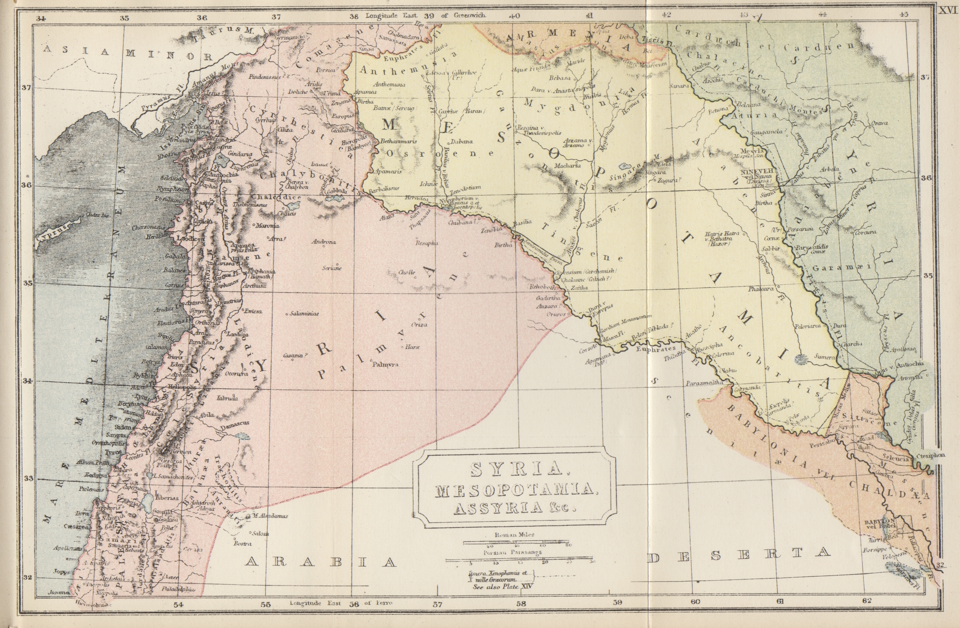그리스인들은 '시리아'와 '아시리아'를 거의 같은 의미로 사용했지만, 로마 제국 시대에는 시리아와 아시리아가 구별되는 지리적 용어로 사용되었다.[26] 로마 제국 시대의 "시리아"는 "소아시아와 이집트 사이에 위치한 제국의 영토", 즉 서부 레반트를 가리켰고, "아시리아"는 페르시아 제국의 일부였으며, 매우 짧은 기간(서기 116~118년, 로마의 영토 확장의 역사적 정점) 동안만 로마의 지배를 받았다.5. 3. 로마 시리아