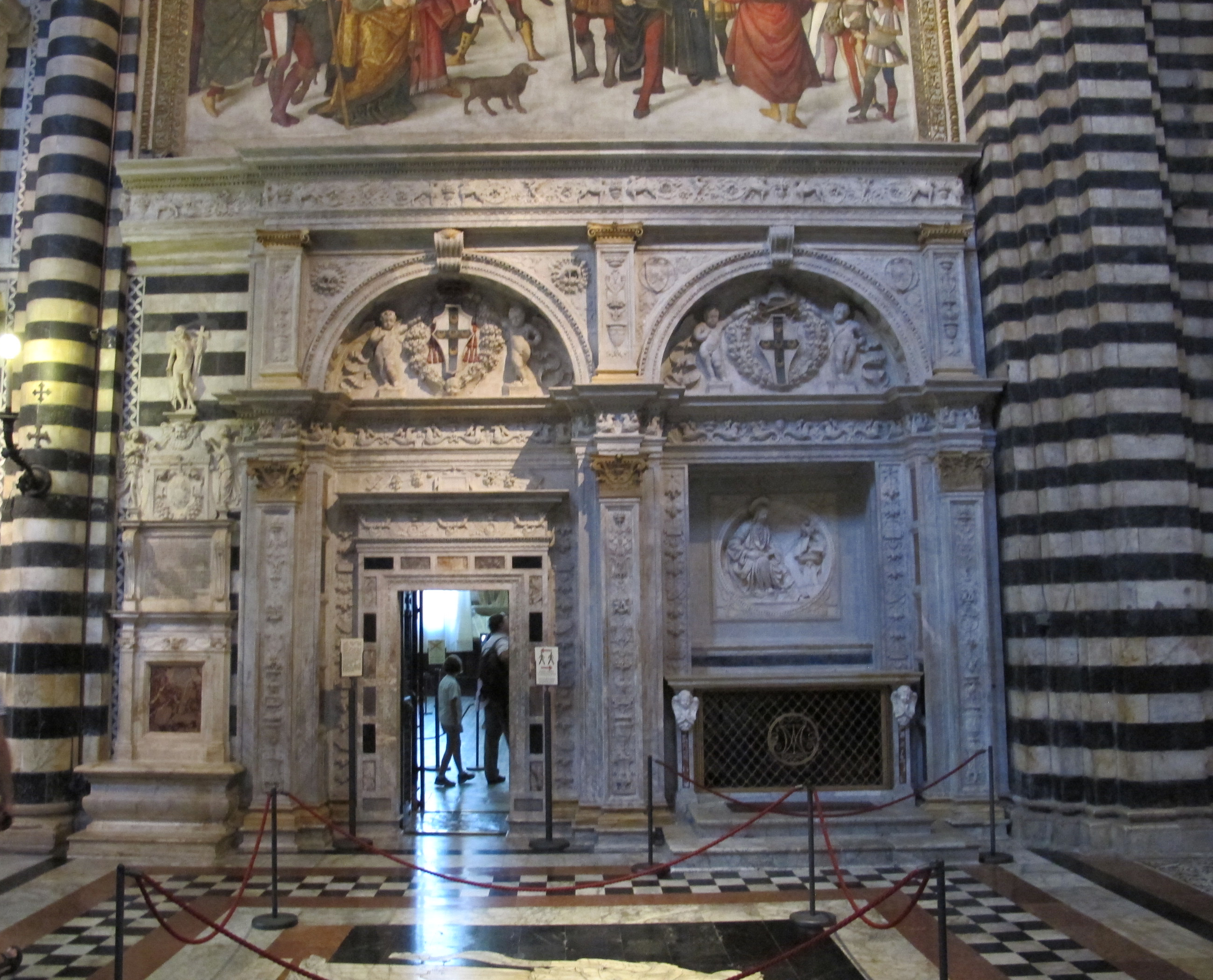 대성당 왼쪽에 위치한 도서관 입구는 두 개의 큰 아치가 있는 대리석 기념물로 구분된다.[17] 이 대리석 입구는 로렌초 디 마리아노(Lorenzo di Mariano)가 1497년에 건설했으며, 조반니 디 스테파노가 만든 '성 요한 복음사가'(추정)의 둥근 부조와 제단 아래 알베르토 디 베토 다 아시시(Alberto di Betto da Assisi)가 1421년에 만든 다색의 '피에타'가 있다. 입구 위에는 핀투리키오가 1504년에 그린 '피우스 3세의 교황 대관식' 프레스코화가 있다.[18]