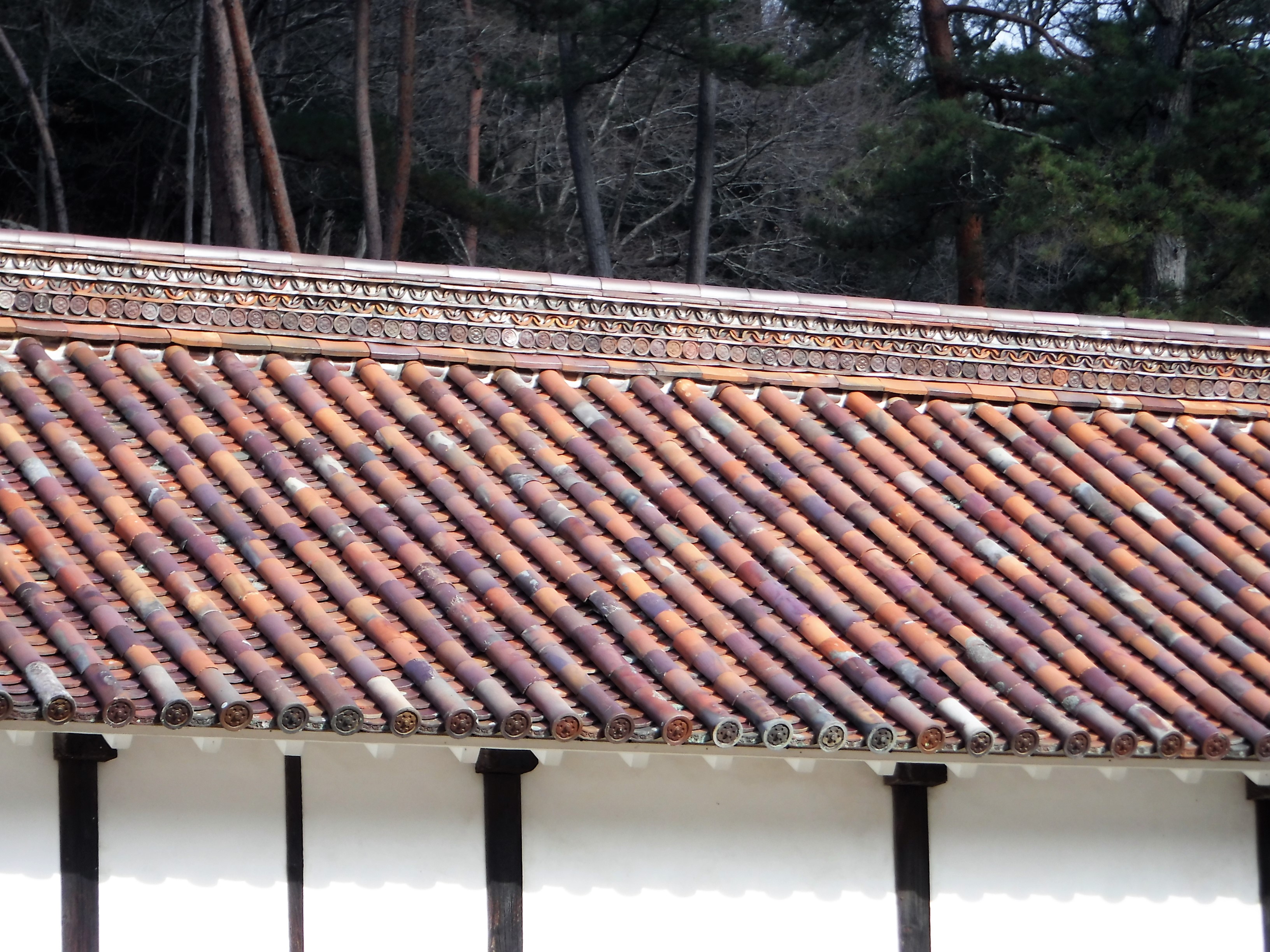 시즈타니 학교의 기와는 유약을 사용하지 않은 요변 기와로, 굽는 정도에 따라 색상이 달라지는 것이 특징이다. 일반 기와의 수명이 60년 정도인 데 비해, 시즈타니 학교의 기와는 300년이 지나도 거의 깨지지 않고 사용되고 있다.[9] 높은 내구성은 고온에서 소결되었기 때문이지만, 제작 과정에서 변형이 일어나기 쉽고 지붕에 덮었을 때 틈이 생겨 누수가 발생하기 쉽다는 단점이 있어 다양한 누수 대책이 시행되었다.[10] 간곡 신사에는 이케다 가문의 문양을 본뜬 나비 문양 처마 기와가 사용되었고,[10] 성묘에는 무지 처마 기와가 사용되었다.[10]