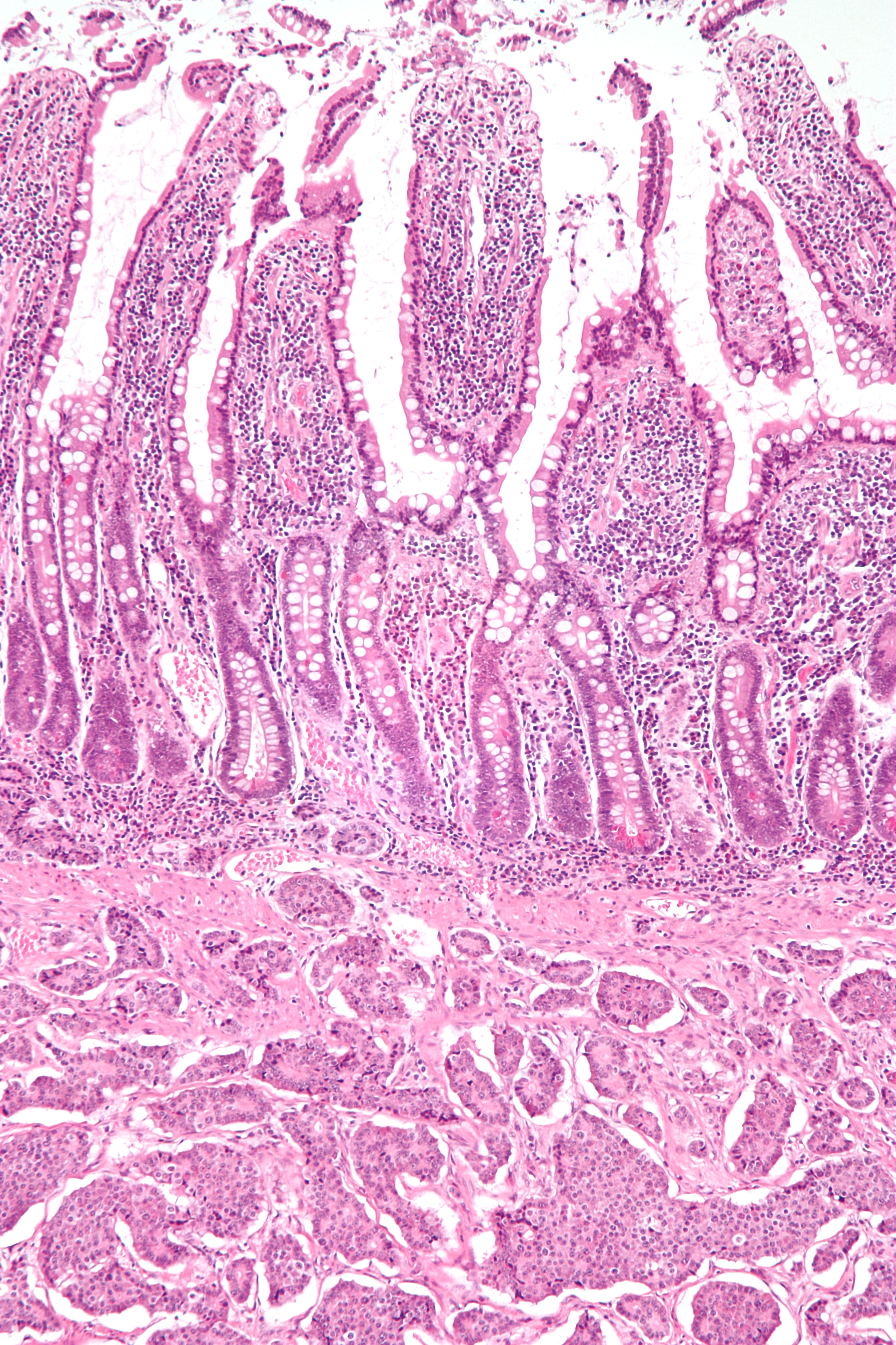 때때로, 출혈 또는 종양 덩어리의 영향이 나타나는 증상이다. 장 폐쇄가 발생할 수 있으며, 이는 때때로 종양 부위의 심한 섬유모세포 반응 또는 장간막의 섬유증 효과로 인한 신경내분비 종양(NET) 분비물의 영향일 수 있다.[89]