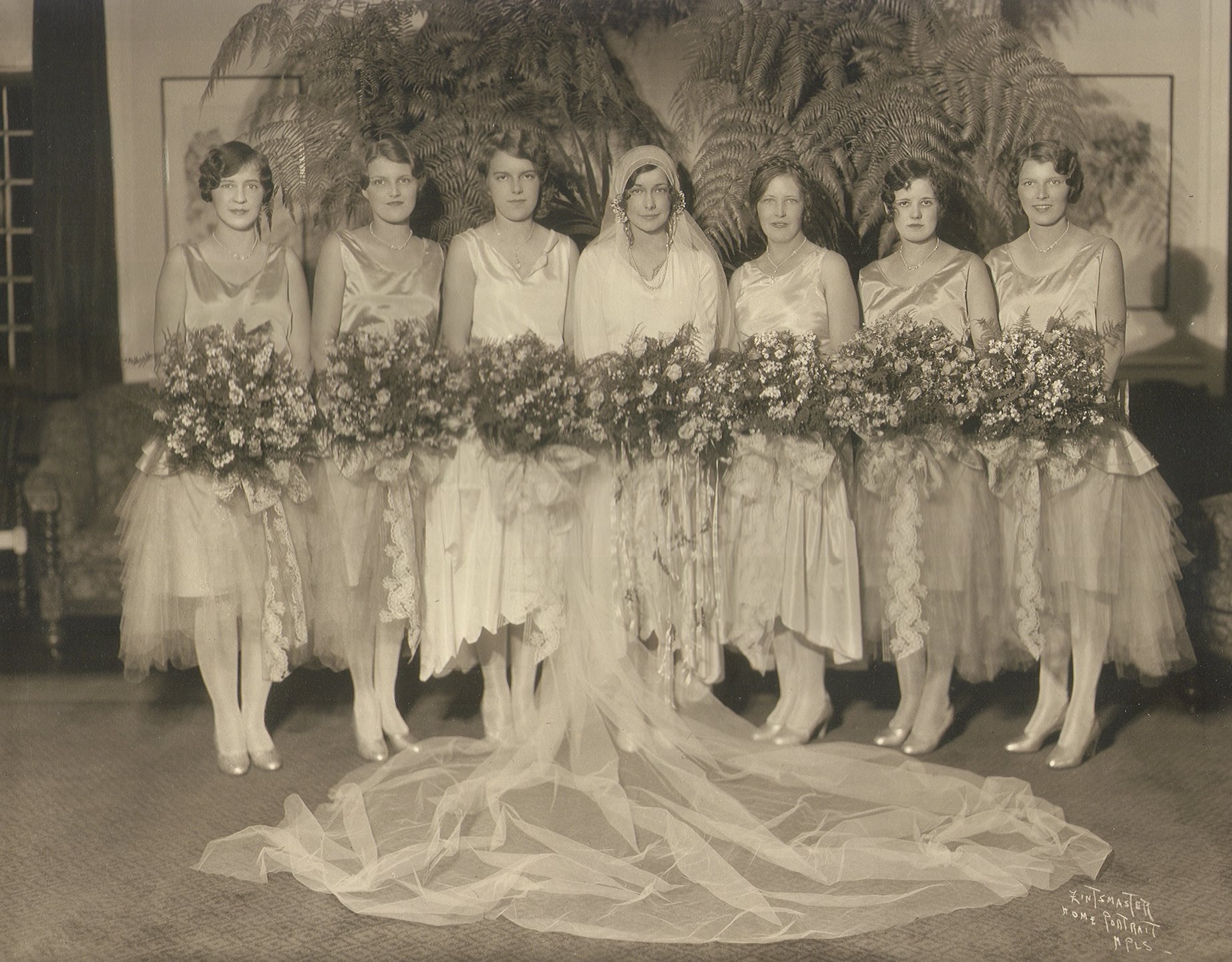 신부(가운데)와 신부 들러리(왼쪽에서 세 번째)와 들러리들. 신부 들러리는 다른 들러리들과는 다소 다른 드레스와 주례 바로 오른쪽에 위치하는 전통적인 명예로운 위치로 구별할 수 있다. 1929년, 미네소타, 미국에서.