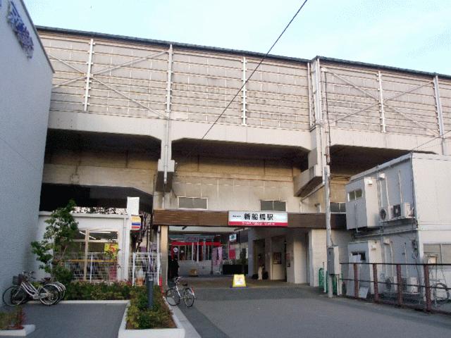 역 동쪽 시도에서는 동쪽 출구, 역 남쪽 시도 및 이온 몰 후나바시에서는 서쪽 출구를 통해 역으로 접근할 수 있다. 1980년 12월 17일 후나바시역 - 당역 북쪽 구간 고가화로 지상역이었던 신후나바시 역도 고가역이 되었고, 이전의 건널목은 제거되었다.