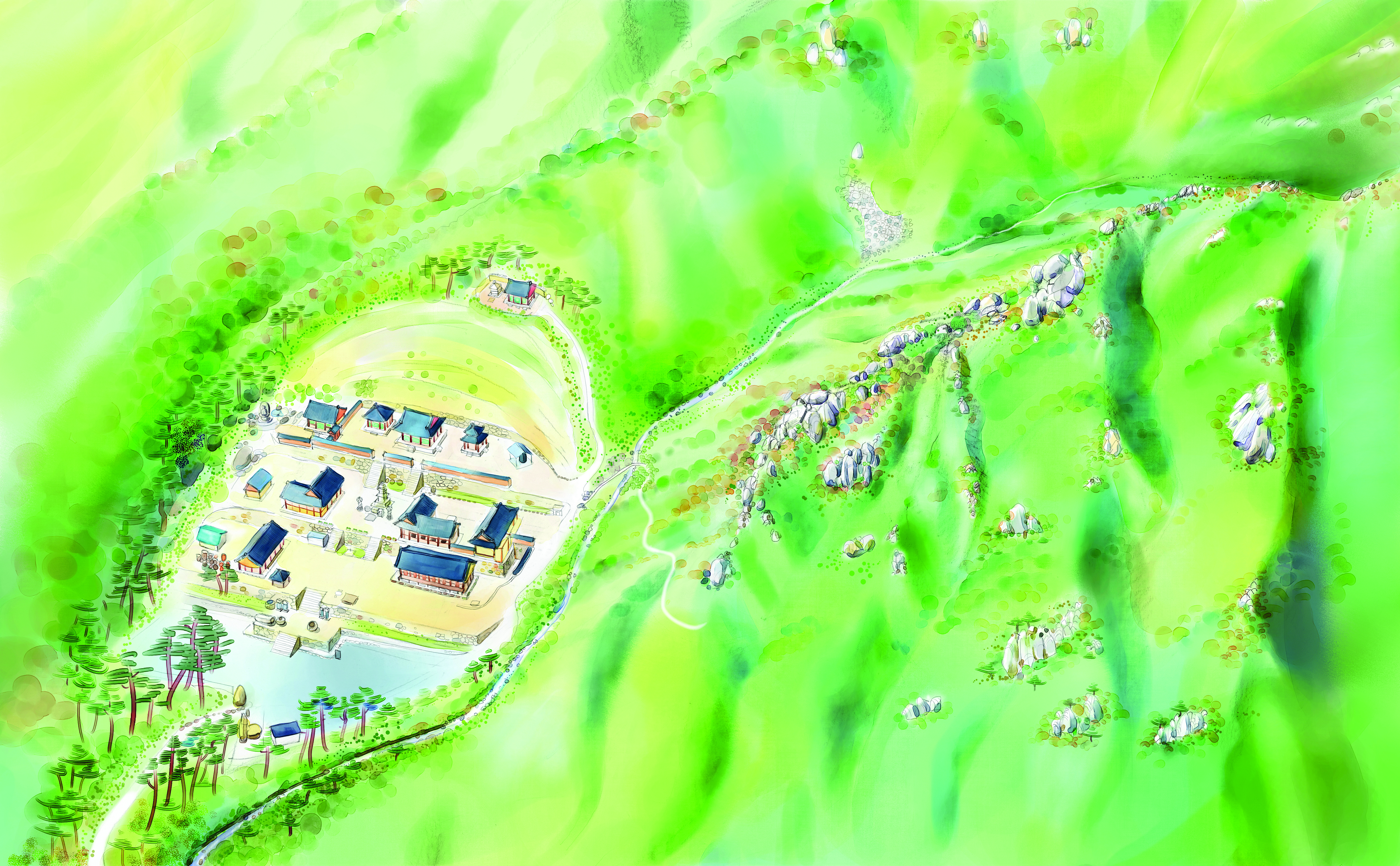 2003년 복원하기 전 실시한 발굴조사에서 남북 약 80m, 동서 약 100m 정도의 대지에 4단의 계단식 축대 위에 금당 3개를 갖춘 전형적인 통일신라시대의 산지 사찰터임을 확인했다고 한다. 또, 불사 중 발견된 여러 유물들이 있는데, 석조불상대좌, 배례석, 불상광배, 석조비로자나불좌상, 배례석, 석탑기단갑석 등이 그것으로 이들 유물은 일괄 경상북도 문화재자료 제525호로 지정되었다.