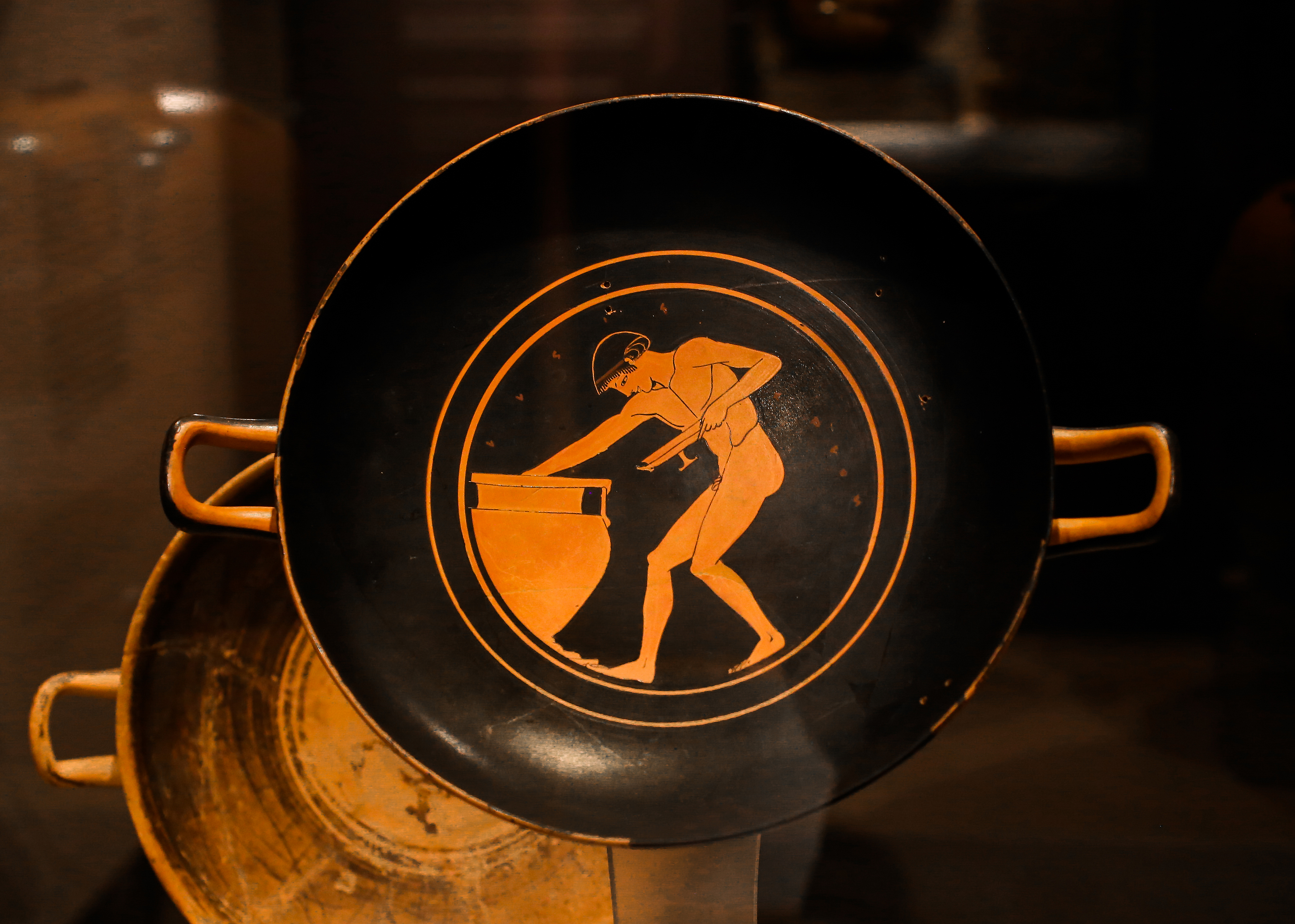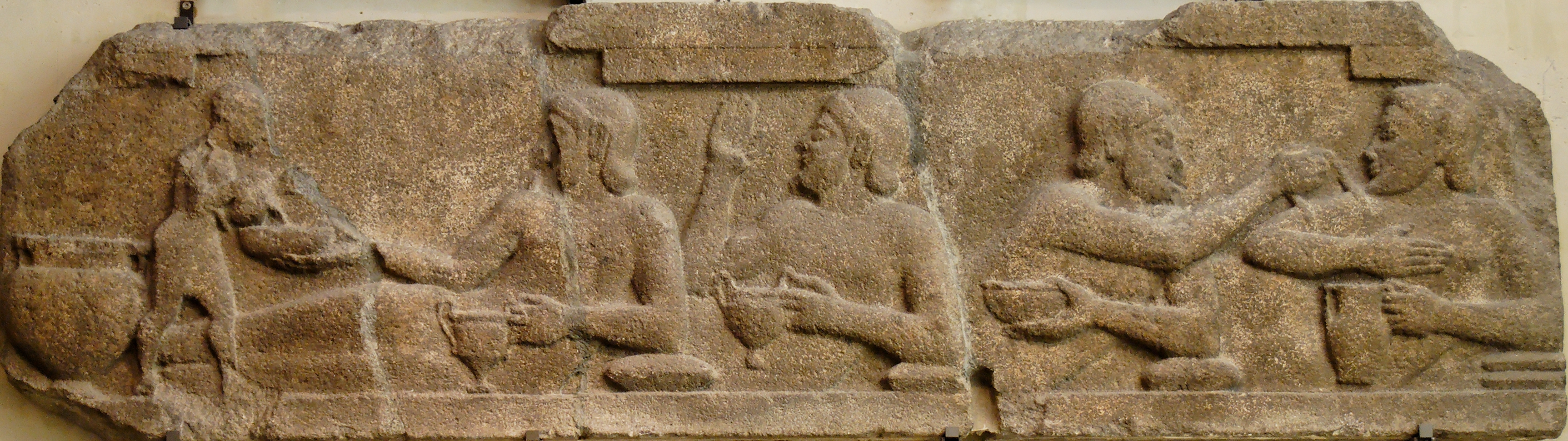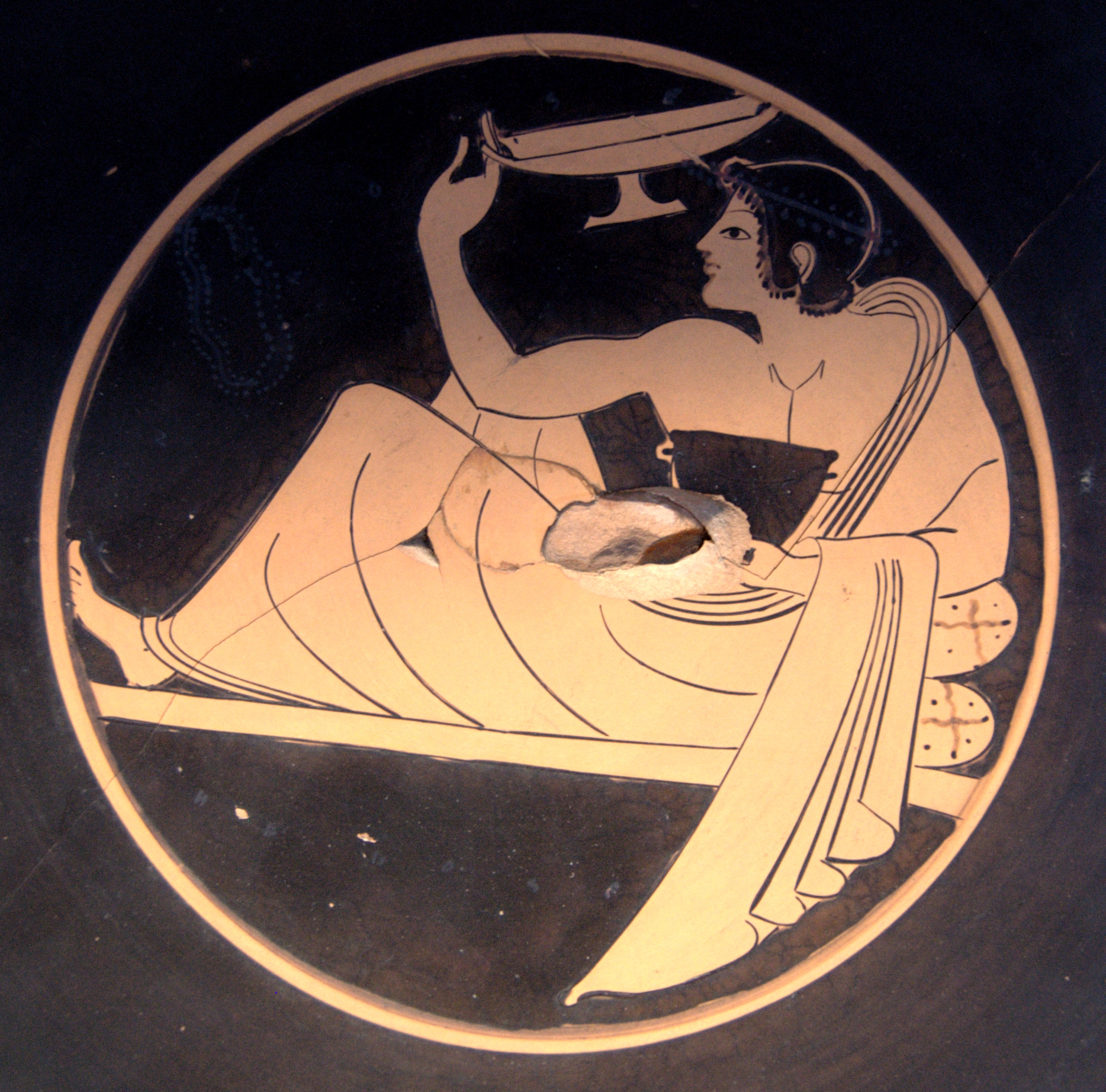 심포지엄은 종종 아티카 도자기에 등장하며, 리처드 T. 니어(Richard T. Neer)는 아티카 도자기의 주된 기능이 심포지엄에서 사용하기 위한 것이었다고 주장했다.[9] 포도주를 담는 주전자로는 암포라가 사용되었고, 보통 한 개의 잔이 여러 남자들 사이에서 돌려 사용되었다.[10] 심포지엄에서 사용된 잔은 암포라만큼 정교하지 않았다. 심포지엄에서 사용된 도자기에는 종종 디오니소스, 사티로스, 그리고 음주와 축하와 관련된 다른 신화적인 장면들이 그려져 있었다.[11]2. 5. 에트루리아와 로마의 연회