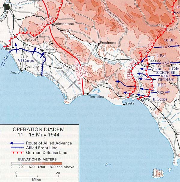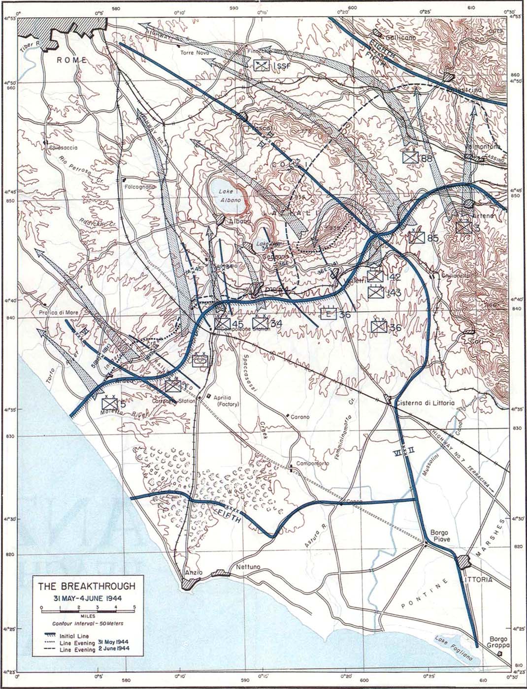1944년 5월 23일, 연합군은 버팔로 작전을 개시했다.[76] 독일군은 큰 피해를 입었지만 완강히 저항했다.[77] 5월 25일, 미군 제3사단은 치스테르나를 함락시켰고,[80] 같은 날 벨레트리 전선의 틈새로 진격해 제1기갑사단 일부는 발몬토네에서 5km 이내까지 접근하여 헤르만 괴링 사단과 교전했다.[80]