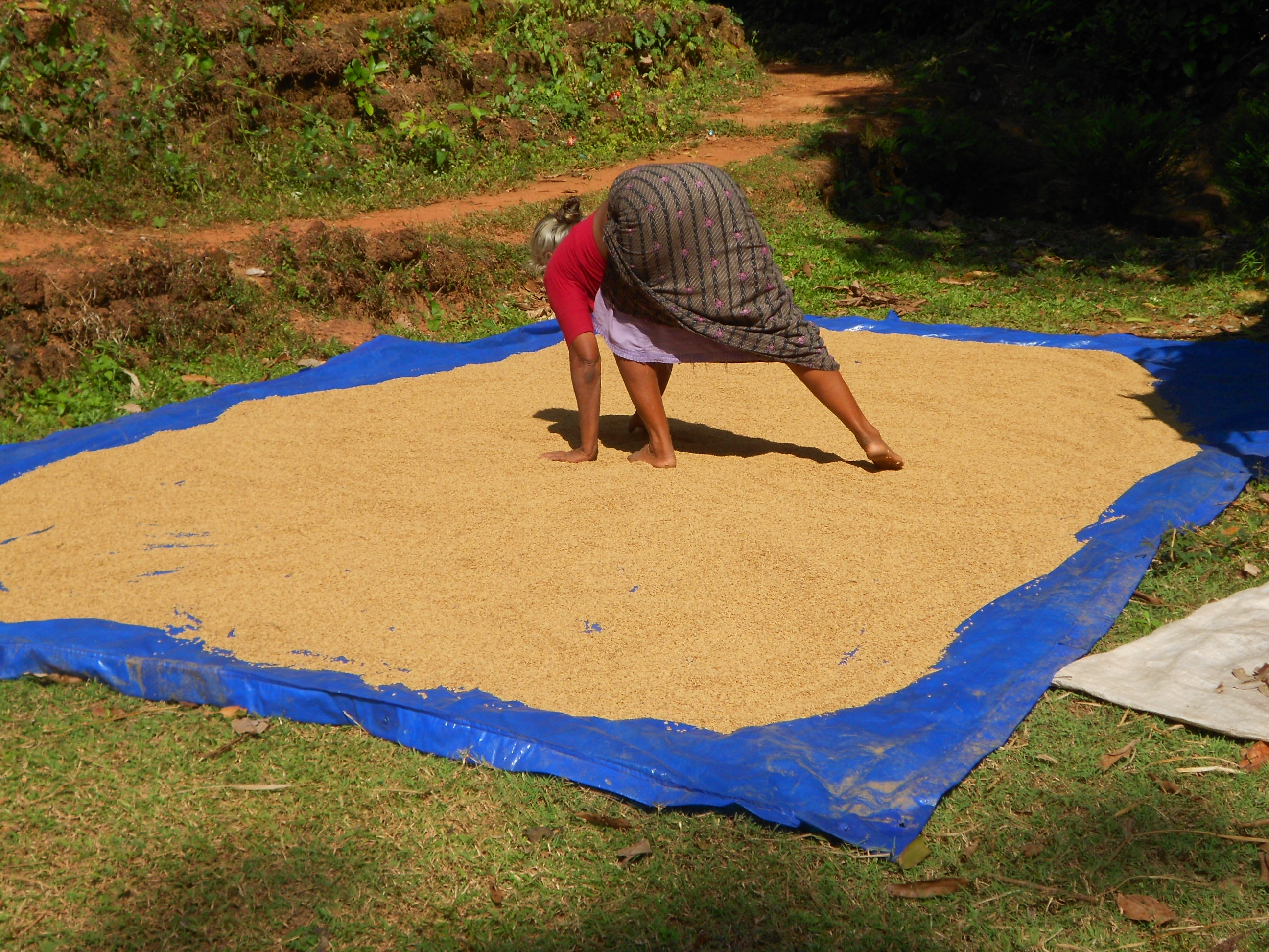 아시아에서 도정하지 않은 쌀(논벼, 인도네시아어와 말레이어: padiid)은 전통적으로 소규모 농업을 통해 수동으로 수확했다. 대규모 농장에서는 콤바인 수확기를 사용하기도 한다.[12] 수분 함량이 20~25%일 때 수확하며, 벼 베기, 쌓기, 탈곡, 키질 또는 체질 등의 과정을 거친다.[13] 쌀알은 곰팡이로부터 보호하기 위해 햇볕에 말리는 등 최대한 빨리 건조한다.[14]
