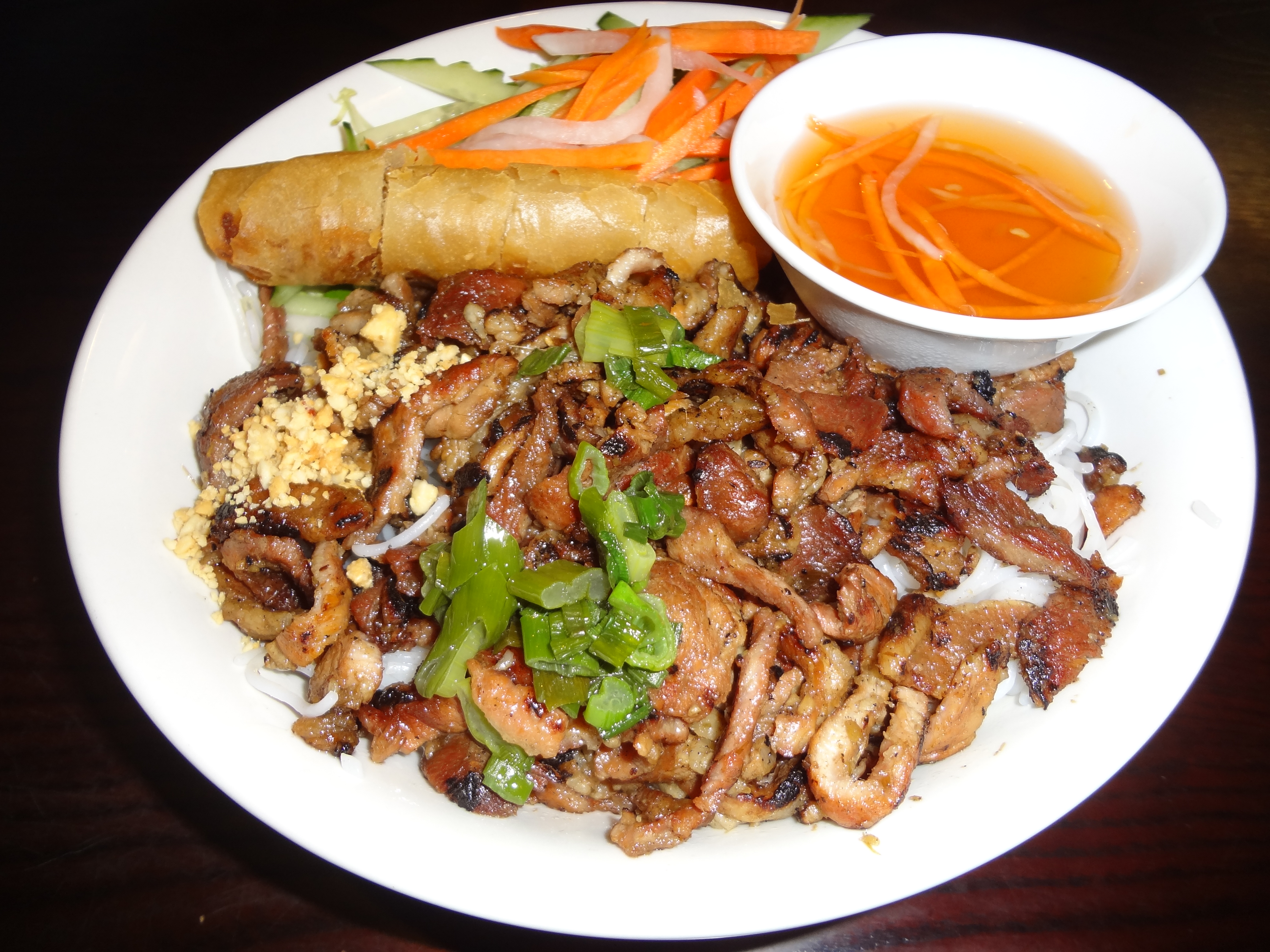 고이 꾸온 | 돼지고기, 새우와 허브를 쌀 종이 롤에 넣은 쌀국수. 느억 짬과 함께 제공된다. |