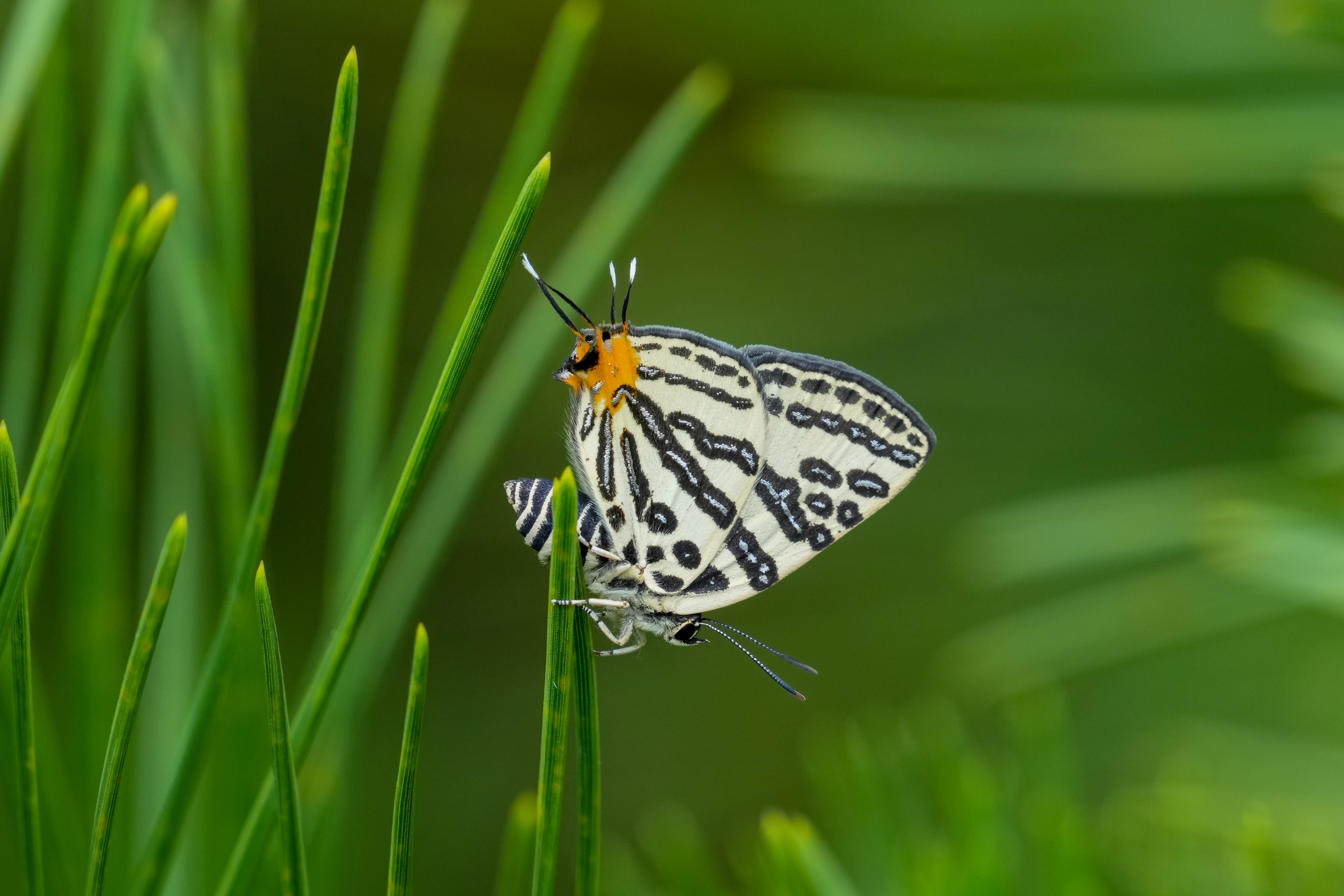 크림색 바탕에 검고 굵은 선이 있으며, 그 검은 선 중앙에는 더욱 깊은 녹색 광택을 가진 선이 뻗어 있다. 한쪽 날개에 2개씩, 총 4개의 꼬리 모양 돌기가 있다. 돌기의 끝은 하얗고, 그 기부(뿌리)는 옅은 오렌지색이다. 복부는 크림색과 검은색의 얼룩무늬로 을 연상시킨다.