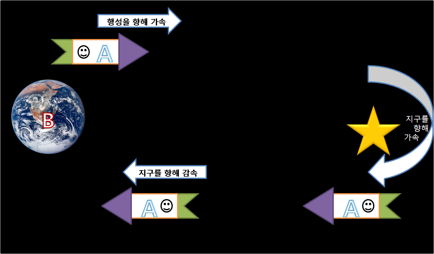 2구간 | 별을 향해 감속 (지구를 향해 가속) | 별 방향 | A의 시간이 B보다 느림 |