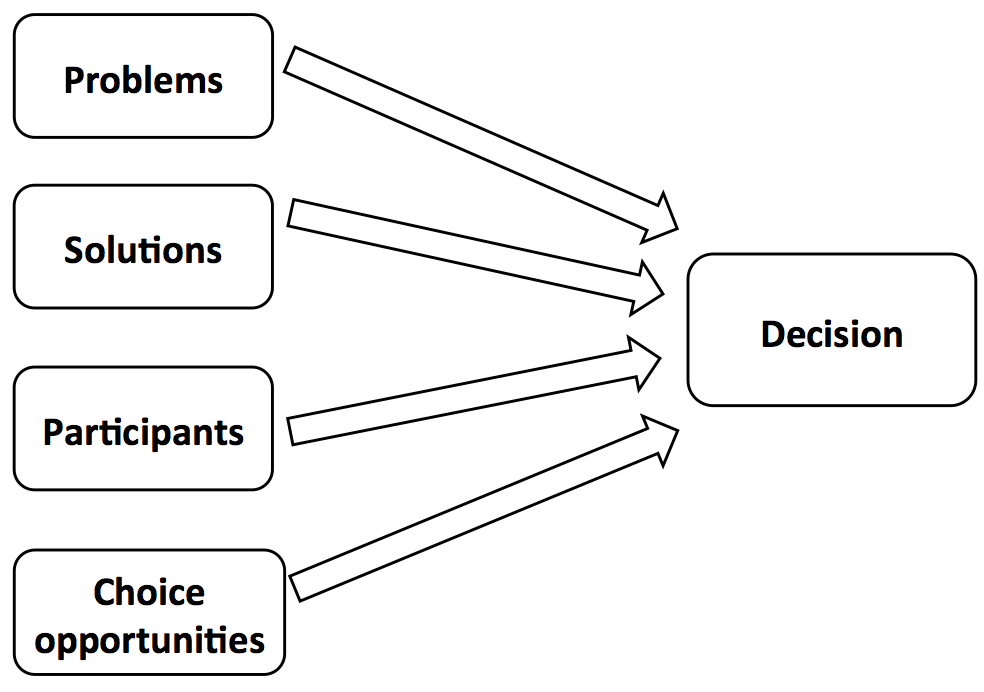 문제, 해결책, 참여자는 선택 기회라는 흐름으로 합쳐지며, 이 과정은 우연, 시기, 참여자에 따라 달라진다.[1]