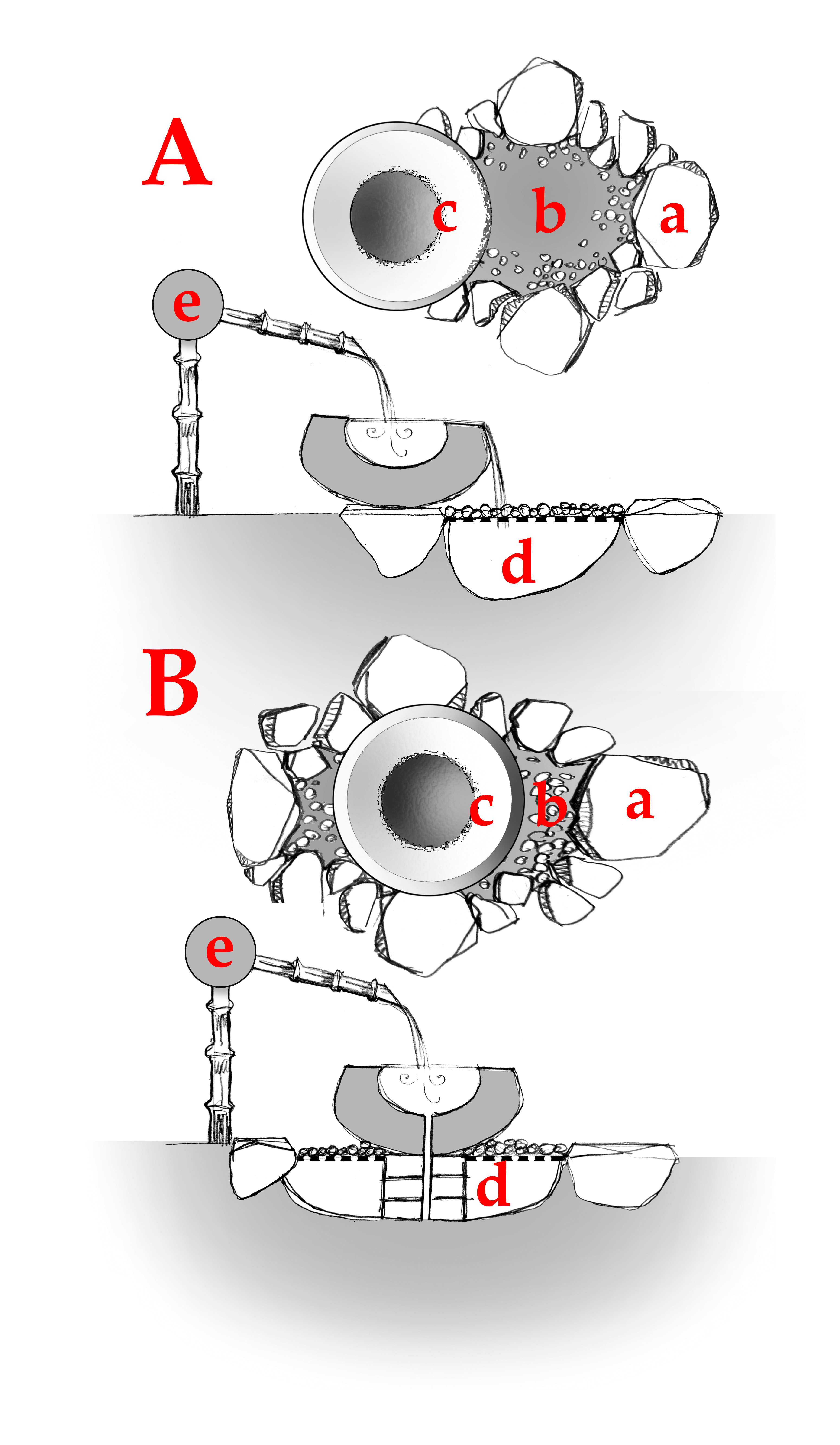 '''수문''': 바다라고도 불린다. 수반과 역석에 둘러싸인 낮은 부분으로, 엎질러진 물을 받기 위해 자갈 등을 깔아 놓는다.