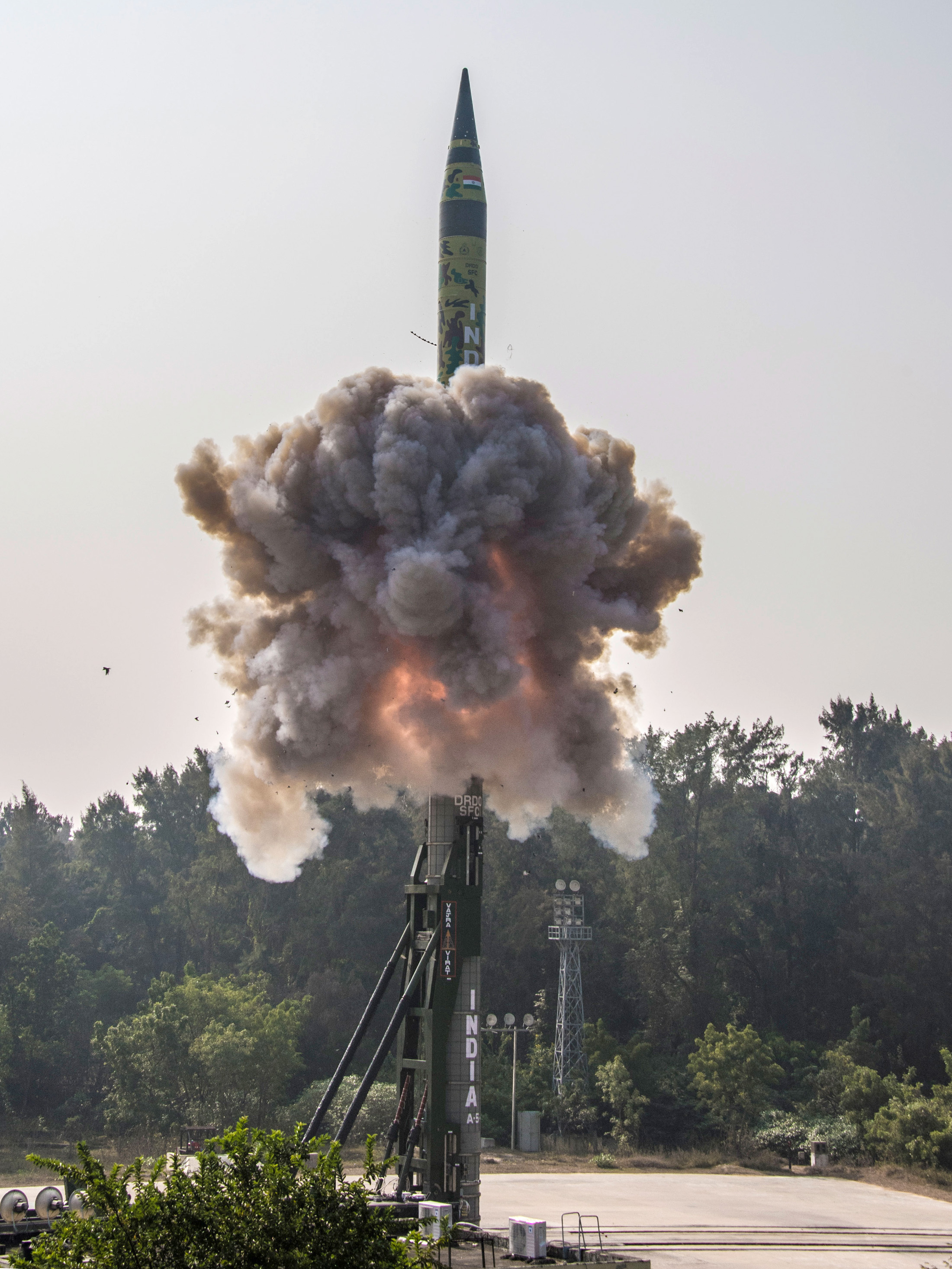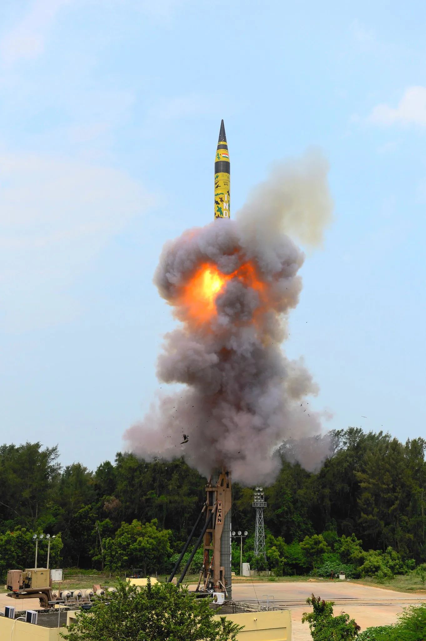 아그니 5는 인도에서 개발한 대륙간 탄도 미사일(ICBM)이다. 중국에 대한 핵 억지력 강화를 목표로 개발되었으며, 사거리 5,000km 이상으로 베이징을 포함한 중국 전역을 타격할 수 있다. 2012년 첫 시험 발사에 성공했으며, 2024년에는 MIRV(다탄두 개별 재진입 비히클) 기술을 적용한 시험 발사에 성공했다. 아그니 5는 고체 연료 로켓을 사용하며, 캐니스터 발사 시스템을 통해 기동성을 높였다.