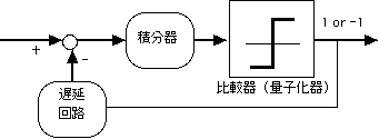 가장 간단한 형태인 1비트 양자화(비교기)를 사용하는 1차 델타-시그마 변조기를 예로 들면 다음과 같다.[26]