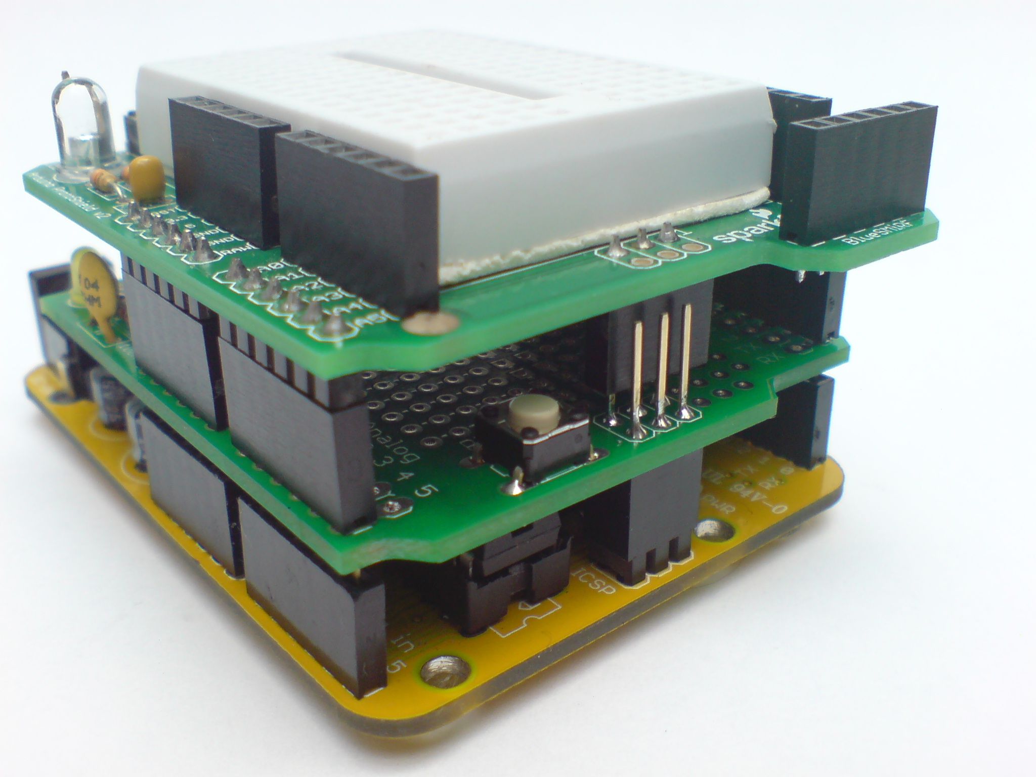 아두이노 보드는 다른 회로에서 사용할 수 있도록 마이크로컨트롤러의 대부분의 I/O 핀을 노출한다. ''Diecimila'', ''Duemilanove'', 및 현재 ''Uno''는 14개의 디지털 I/O 핀을 제공하며, 그 중 6개는 펄스 폭 변조 신호를 생성할 수 있고 6개의 아날로그 입력은 6개의 디지털 I/O 핀으로도 사용할 수 있다. 이러한 핀은 암 0.1인치(2.54 mm) 헤더를 통해 보드 상단에 있다. 여러 플러그인 애플리케이션 쉴드도 상업적으로 이용 가능하다. 아두이노 나노 및 아두이노 호환 Bare Bones Board[32] 및 Boarduino[33] 보드는 브레드보드에 연결할 수 있는 보드 하단에 수 핀 헤더를 제공할 수 있다.