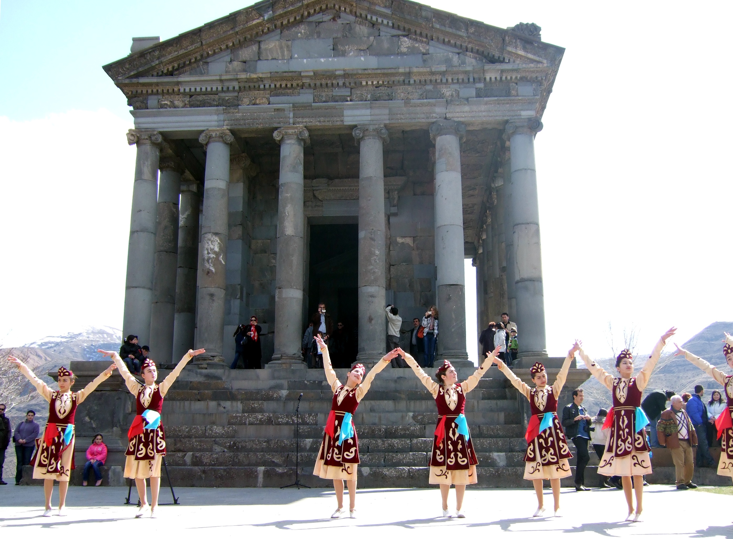 아르메니아 민속 춤을 가르니 사원 앞에서 아르메니아 신이교 새해를 기념하여 추고 있다.