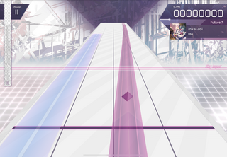이 게임은 3D 리듬 메카닉을 특징으로 하며, 특히 Present, Future 및 Beyond 난이도에서 두드러진다. 이 스크린샷은 Future 난이도의 곡에서 그러한 메카닉을 보여준다.