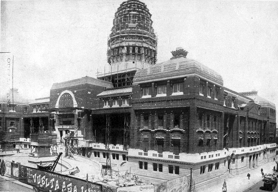 국회 궁전의 아이디어는 1895년에 처음 제안되고 법령으로 제정되었다.[3] 이탈리아 건축가 비토리오 메아노가 설계하고 아르헨티나 건축가 훌리오 도르말이 완공한 이 건물은 1898년부터 1906년까지 건설되었다.[4] 그 해에 완공되었지만, 미적인 세부 사항은 1946년에야 마무리되었다. 입구 상단의 사두 마차는 조각가 빅토르 데 폴의 작품이며,[5] 아르헨티나 조각가 롤라 모라는 외관을 포함하여 수많은 상징적인 청동상과 대리석 조각상으로 내부 홀과 외부를 장식했다.[1][6]