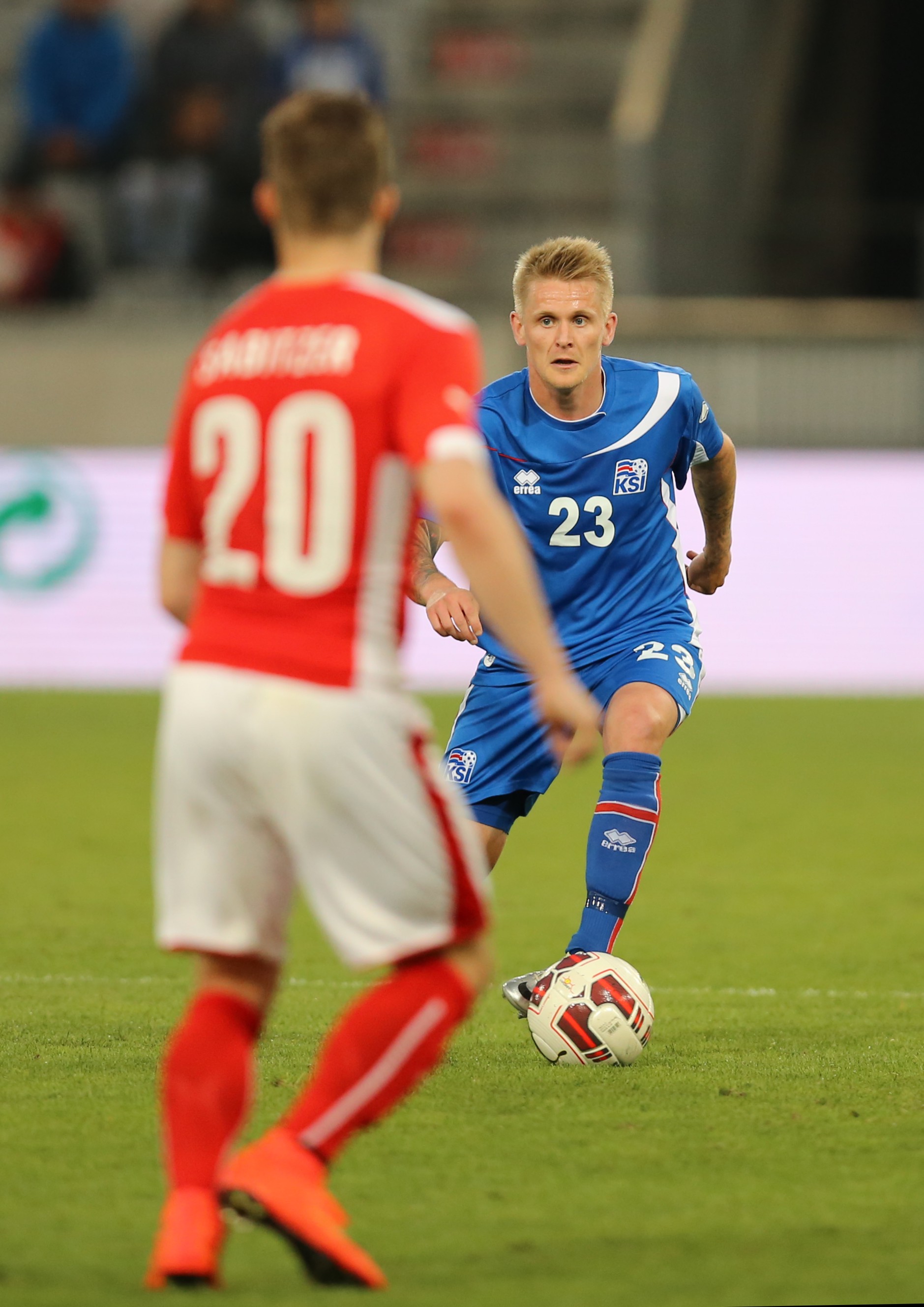 2009년 이란과의 경기에서 아이슬란드 국가대표팀 데뷔전을 치른[14] 아리 프레이르 스쿨라손은 2012년 라르스 라예르백 감독 부임 이후 더 자주 소집되었다.[15] 소속팀에서는 주로 미드필더로 활약했지만, 아이슬란드 대표팀에서는 왼쪽 풀백으로 선발되어 2014년 월드컵 예선 대부분의 경기에서 주전으로 활약했다.[16][20]