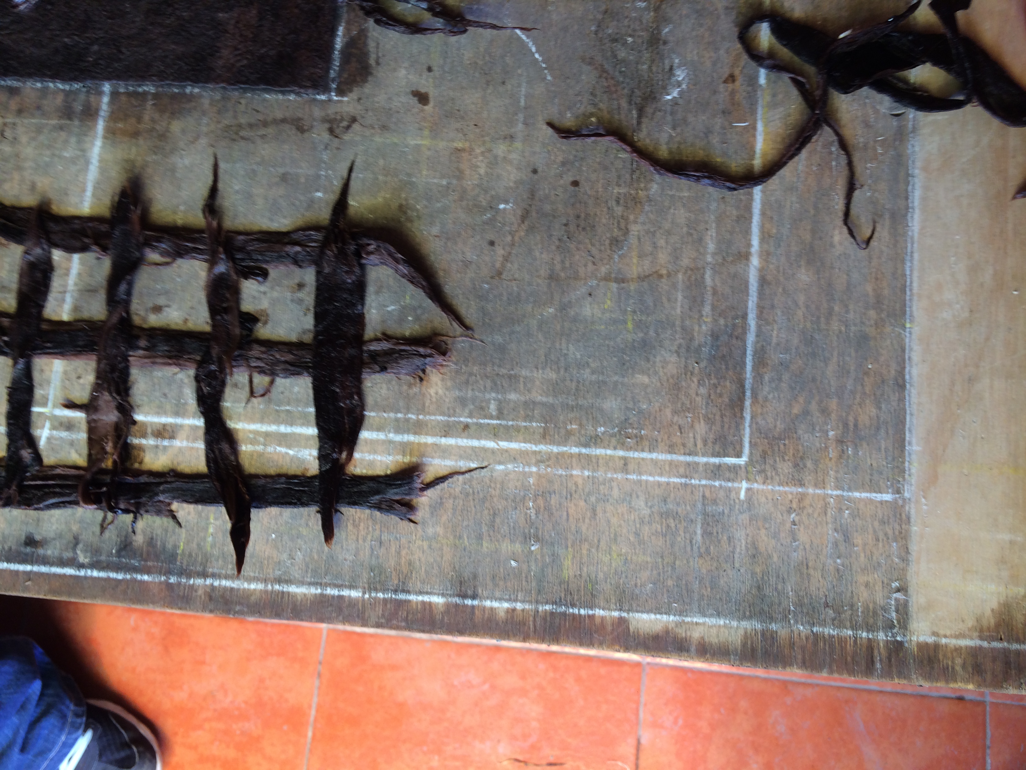스페인 정복 이전 시대에는 껍질을 먼저 하루 이상 담가 부드럽게 한 후에 작업을 했다. 적어도 20세기부터 기록된 혁신은 껍질을 끓이는 것인데, 이것이 더 빠르다. 끓이는 시간을 단축하기 위해 재 또는 석회를 물에 넣었고, 나중에는 산업용 가성 소다로 대체했다. 가성 소다를 사용하면 실제 끓이는 시간은 3시간에서 6시간 사이이지만, 설치까지 포함하면 과정은 반나절에서 하루가 걸린다. 특정 기상 조건(건조한 날)에서만 가능하며, 지속적인 주의가 필요하다. 한 번에 끓이는 양은 60~90kg이며, 가성 소다 3.5kg을 사용한다. 껍질을 계속 저어주어야 한다. 끓인 후, 껍질은 깨끗한 물로 헹군다.[66]